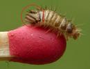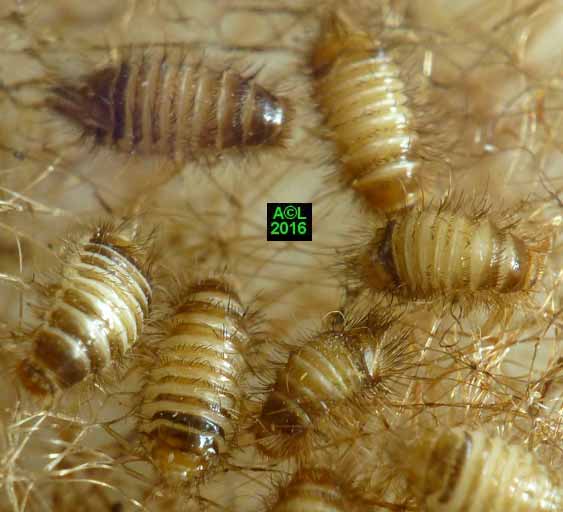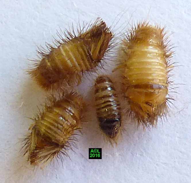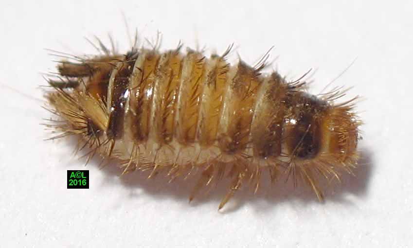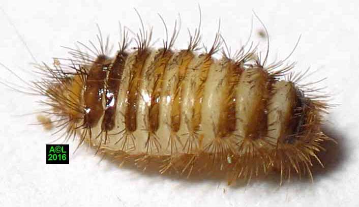 Très velues, et ressemblant à de petites chenilles, les larves d'anthrènes sont dotées d'un solide appétit, et de mandibules à toute épreuve, alors qu'elles sont paradoxalement minuscules. Les larves passent généralement inaperçues car la plupart du temps elles évoluent (dans tous les sens du terme), à l'intérieur des insectes ou matières qu'elles attaquent. Elles sont en outre très petites, et peu remuantes, ce qui ajoute à leur discrétion. Les excréments forment une très fine et typique "poussière", aisément repérable et identifiable, du moins pour un oeil averti.