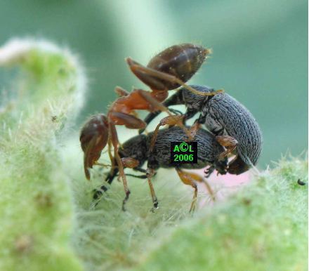 Au passage vous noterez qu'au fil des ans et des évolutions de la classification des insectes cet apion est passé de la Famille des Curculionidae, à celle des Apionidae, puis des Brentidae ! Par-delà le terme de classification, ceux de nomenclature et de systématique sont non moins valides, là où celui de taxonomie est quant à lui consacré par l'usage, bien que l'Académie des Sciences préconise ... taxinomie! L'entomologie c'est aussi cela, et aux yeux de certains c'est même l'art de couper les cheveux en 4 ! Cela dit vous verrez que les cheveux en question ont leur utilité ... sans pour autant devoir les couper en 4 !