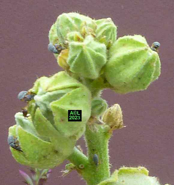 En dépit de l'échelonnement des pontes, et donc de celui des développements larvaires et des émergences, il n'y a qu'une génération annuelle à telle enseigne qu'en milieu pourtant confiné les plus alléchants boutons floraux proposés n'ont pas attiré le moindre individu parmi les nombreux émergeants, et ce quel que soit le sexe. Par-delà l'absence évidente de besoins alimentaires la seule préoccupation de cette nouvelle génération était manifestement de me fausser compagnie afin que chacun puisse trouver un gîte d'hivernage à sa convenance. Bien qu'elles soient vivaces, et puissent donc fleurir tous les ans, je rappelle que les roses trémières sont souvent cultivées en bisannuelles ... au grand dam des apions ! En pareil cas la floraison intervient en effet la seconde année, la première étant consacrée à la seule croissance de la plante.