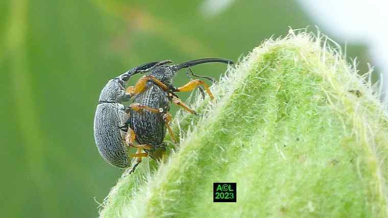 L'apion longirostre, ci-dessous représenté, est un petit Coléoptère faisant partie des très nombreux "charançons" (près de 1500 espèces en France). Numériquement parlant la palme revient aux très atypiques coléoptères que sont les Staphylins, avec 2500 espèces sur notre sol. Toujours pour info, et toujours "chez nous", on dénombre 10862 espèces de coléoptères (source Taxref 2022). Comme tous les "charançons", cet apion porte un "rostre", d'ailleurs fort long, d'où la dénomination latine de Rhopalapion longirostre. Comme vous le verrez cette longueur a sa raison d'être, au demeurant primordiale puisqu'elle conditionne la pérennité de l'espèce.