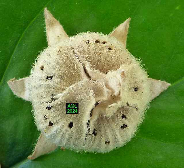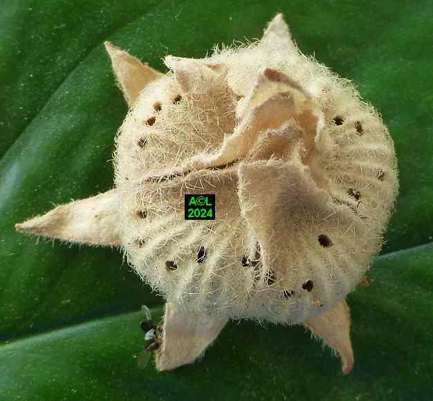 Les oeufs (toujours en petit nombre pour chacun des forages) sont déposés à la surface des étamines précitées lesquelles serviront de nourriture aux larvules qui migreront ultérieurement dans les graines une fois celles-ci formées. Les larves, chacune dans leur graine, pourront alors poursuivre leur développement et donner in fine une nouvelle génération de bestioles.