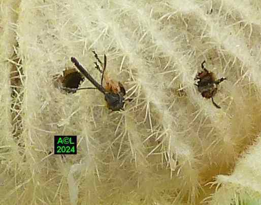 Quasi signature du site, la traditionnelle allumette (ci-dessous) illustre bien la petitesse millimétrique de notre Apion. Il s'ensuit évidemment une grande discrétion de la bestiole, d'autant que les "gendarmes" (Pyrrochoris apterus) sont aussi d'assidus "usagers" des trémières. En raison de leur nombre, de leur taille, et plus encore de leur très voyante parure rouge, ces punaises captent facilement le regard et l'attention, ce qui tend bien sûr à occulter la présence de nos minuscules apions. Les fourmis, elles aussi omniprésentes, font également diversion, et au final notre trio vit selon une sorte d'entente cordiale, si ce n'est en parfaite harmonie. A n'en pas douter cela tient à la luxuriance de la plante qui tel un "garde-manger" abondamment garni n'est pas de nature à favoriser la concurrence, ni l'agressivité pouvant en découler ... si tant est que ces contingences puissent exister !