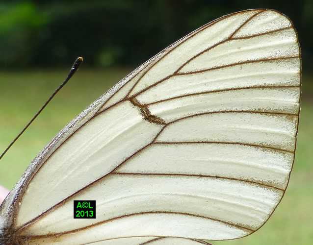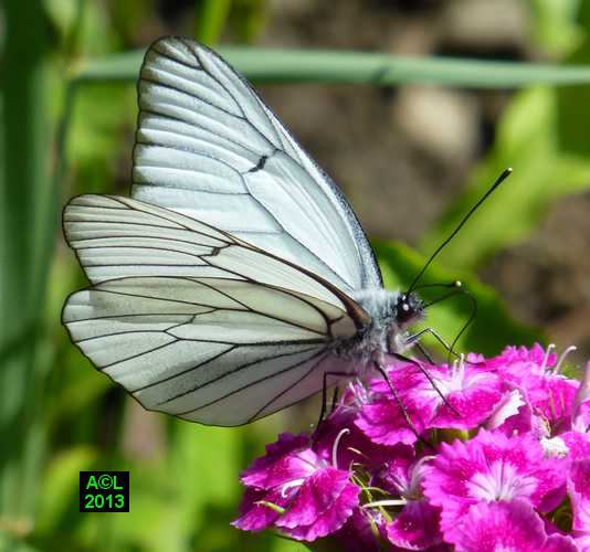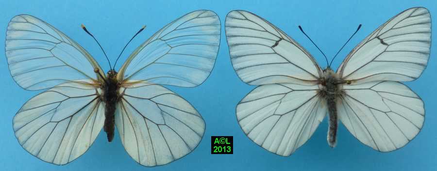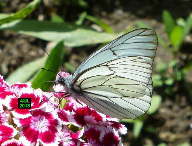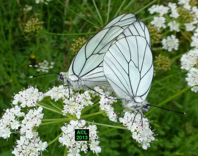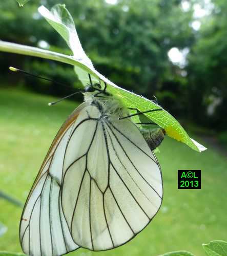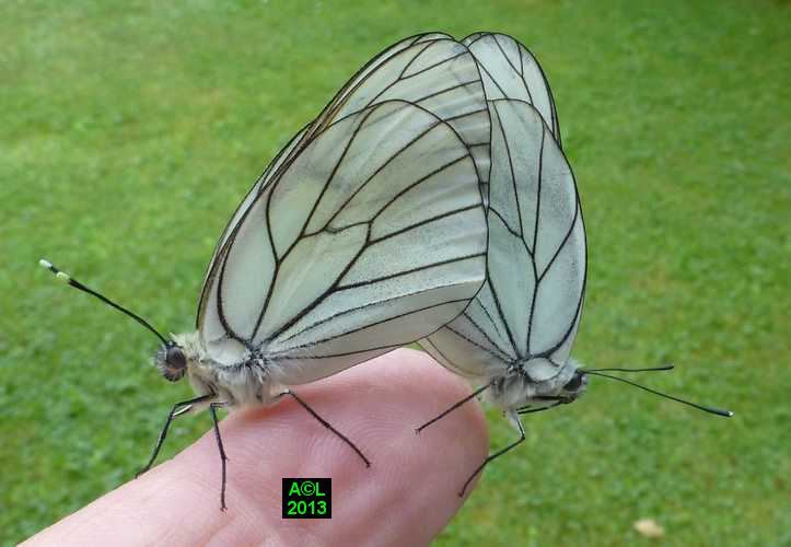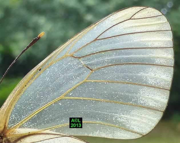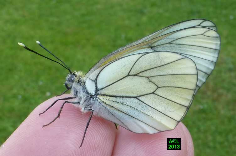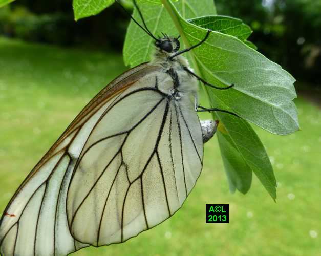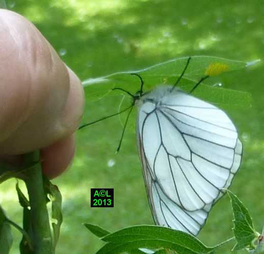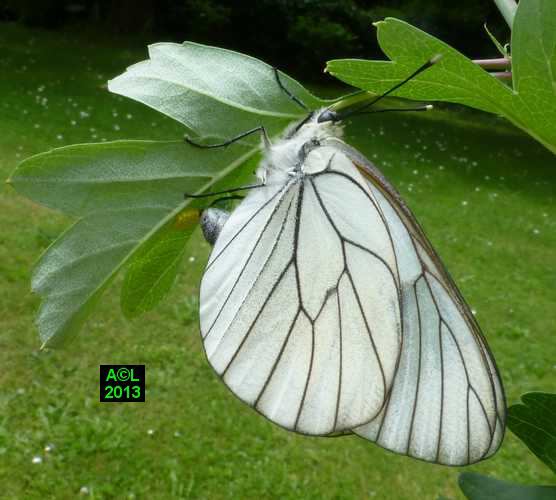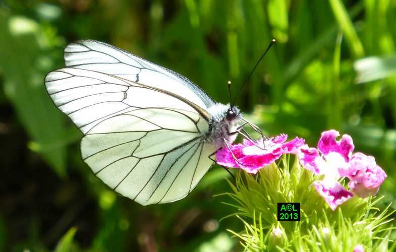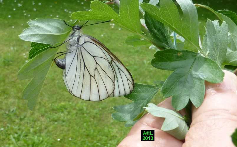 Tout de blanc vêtu, et délicatement nervuré de noir, tel se présente Aporia crataegi, plus communément appelé le "Gazé", ou encore la "Piéride de l'aubépine". Au passage vous noterez que son nom scientifique fait à la fois référence à sa plante nourricière de prédilection, et à la réduction du nombre des écailles, nettement observable chez les femelles.