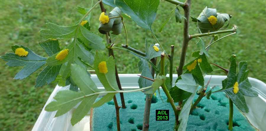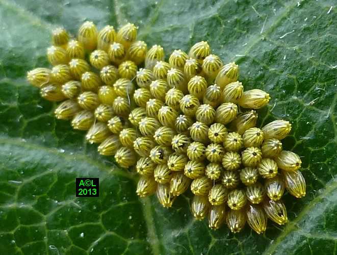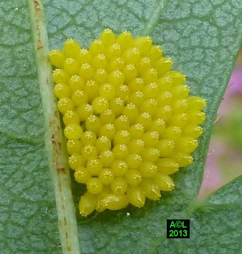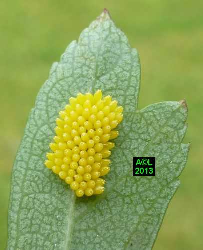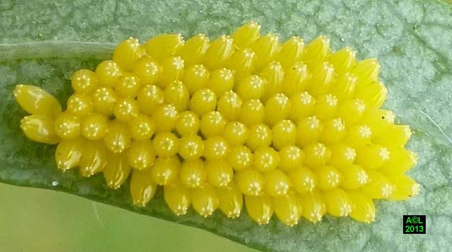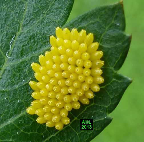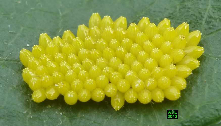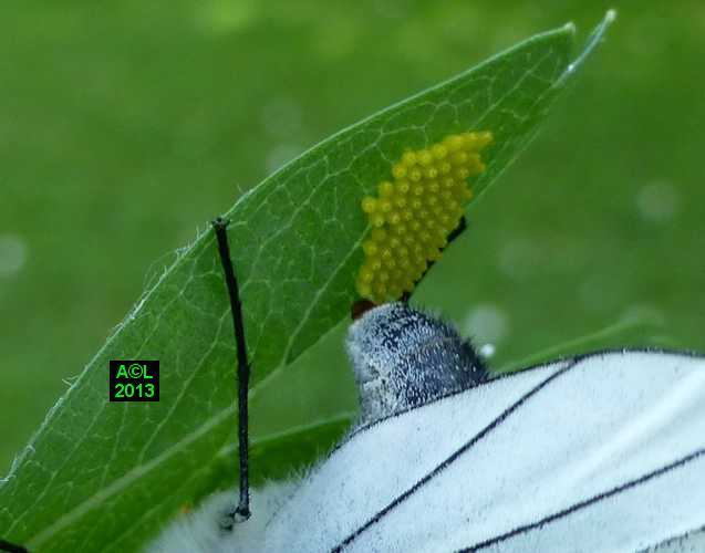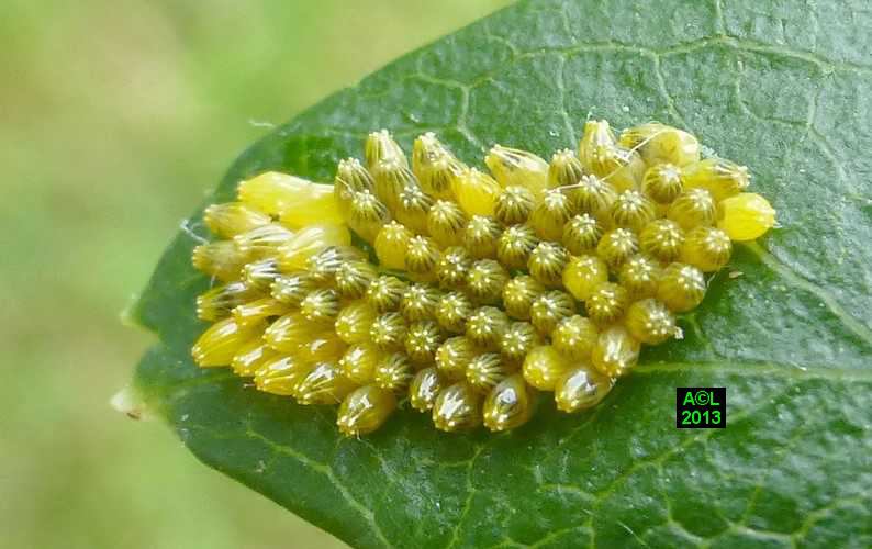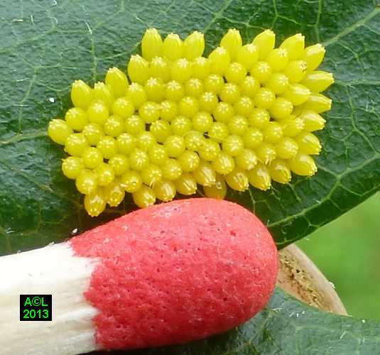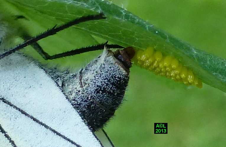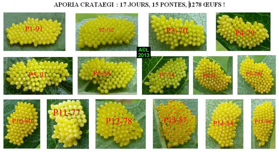 .J'étais bien sûr ravi, mais loin d'imaginer la suite, car entre le 12 et le 27 juin (2013 ! ) la femelle m'a gratifié de 15 pontes pour un total de 1278 oeufs ! Si on me l'avait dit, je ne l'aurais pas cru tant ce chiffre est exceptionnel, car chez les papillons dits "de jour" la norme est de l'ordre de 200 à 300 oeufs. Certes cette femelle était on ne peut plus "bichonnée", et la réduction de son espace vital limitant ses besoins énergétiques, on peut supposer que le surplus a profité à la ponte. C'est là une simple hypothèse car il faut également tenir compte de l'hivernage des très jeunes chenilles, d'où un facteur de risque important ... et la nécessité de compenser la "casse" !