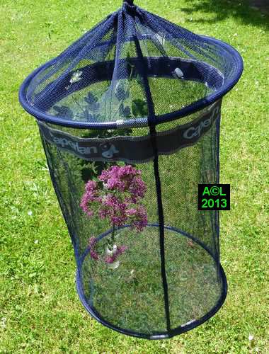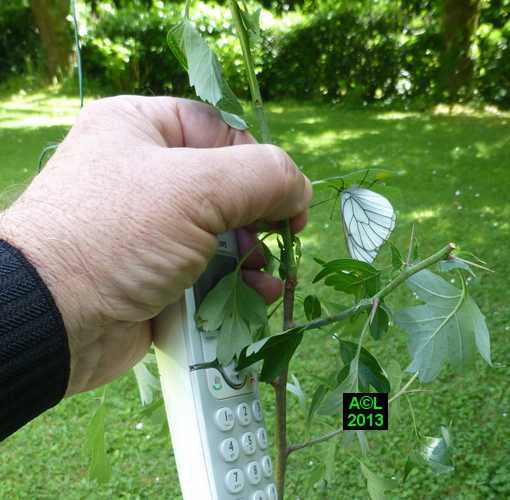 Trouvé accouplé, le duo s'est séparé lors de son introduction dans la bourriche ci-dessus présentée, puis il s'est de nouveau accouplé quelques minutes plus tard, ce qui était de fort bon augure pour la suite. Moyennant la mise à disposition d'une grappe fleurie de buddleia, d'une branchette d'aubépine pour "attirer" les oeufs, et de brumisations à l'eau de pluie au plus chaud de la journée, j'ai obtenu une première ponte le 12 juin, soit 48 h après capture et accouplement