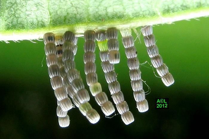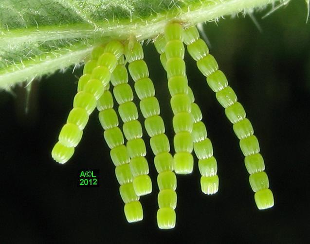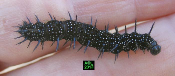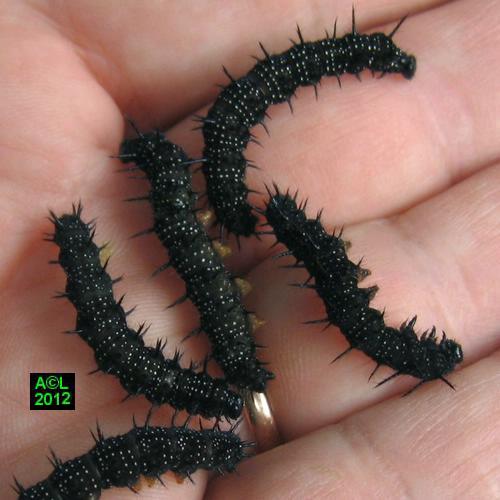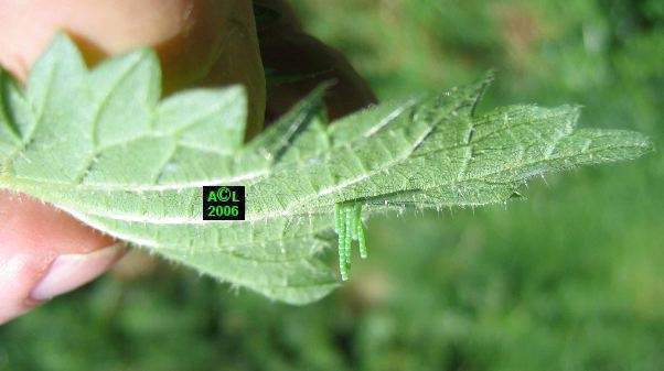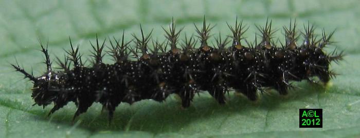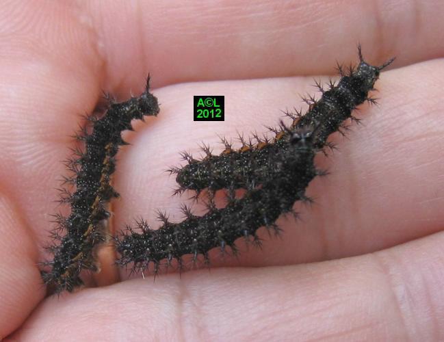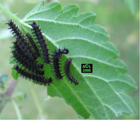 Chenilles de "Cartes géographiques" ou chenilles de "Paons du jour", telle est la question pouvant parfois se poser. Outre leur ressemblance, les 2 espèces se développent en effet sur les orties, et leur comportement est de surcroît très comparable. Comme vous le verrez ci-dessous, un minimum d'attention permet cependant d'aisément les différencier.