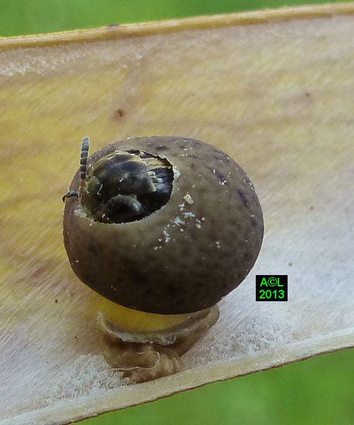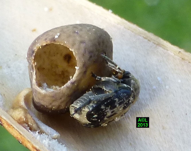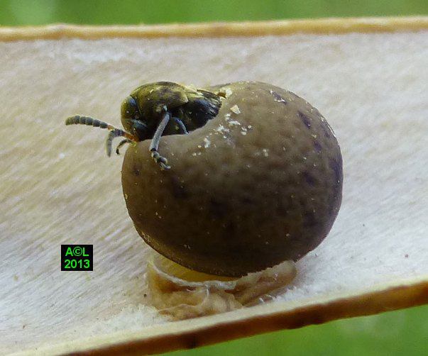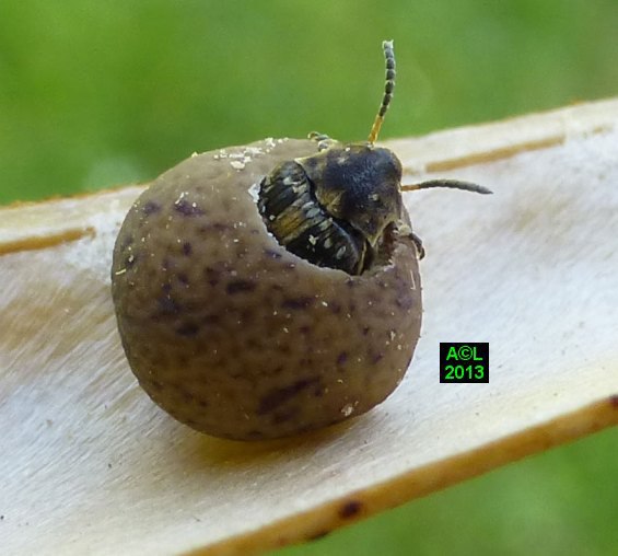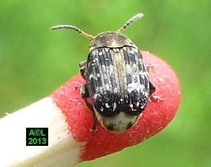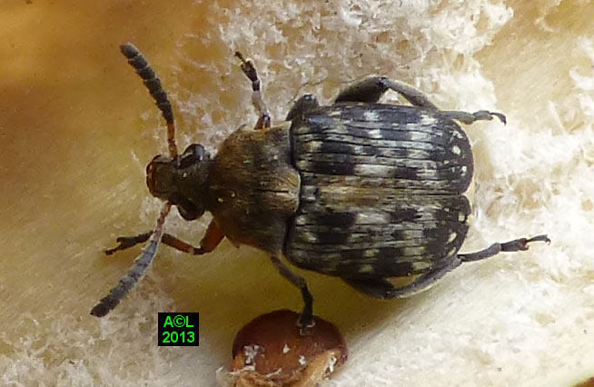 A en croire la littérature spécialisée, la Bruche du pois ( Bruchus pisarum ! ) est strictement monophage, et ne se développe que sur le pois (Pisum sativum). Dans la mesure où la bestiole ci-dessous fait plus que lui ressembler, doit-on considérer que cette bruche s'est adaptée à d'autres pois, fussent-ils de senteur, ou qu'il s'agit en fait d'une espèce voisine, voire jumelle, cas de figure loin d'être exceptionnel au pays des bestioles !