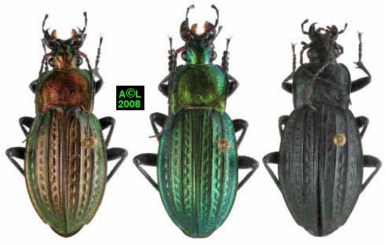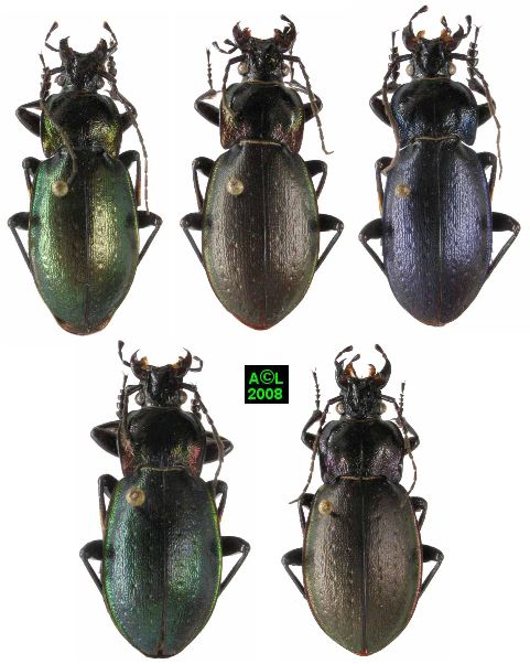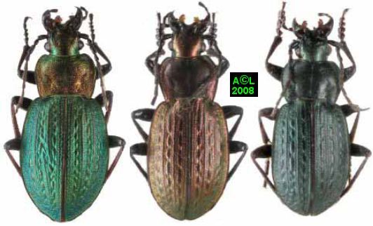 La coloration de ce carabe va du bronzé cuivreux au vert, avec possibilité de rembrunissements modérés. Les formes noires sont très exceptionnelles, et le bicolorisme peu fréquent. La sous-espèce carinatus ( bordures élytrales lisses ! ) couvre la majeure totalité du territoire, où elle se subdivise en 5 ou 6 natios, assorties d' une douzaine de formes individuelles .... pas toujours convaincantes !