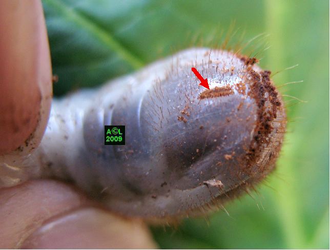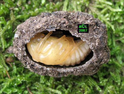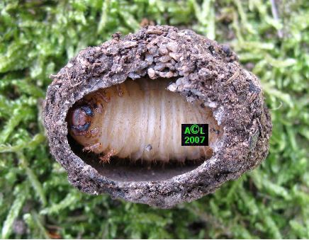 1)- exemple de logettes nymphales; 2)- larve dans sa