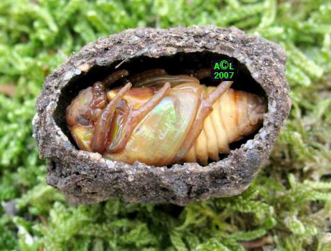 loge; 3)- jeune nymphe "in situ", en vue latérale;