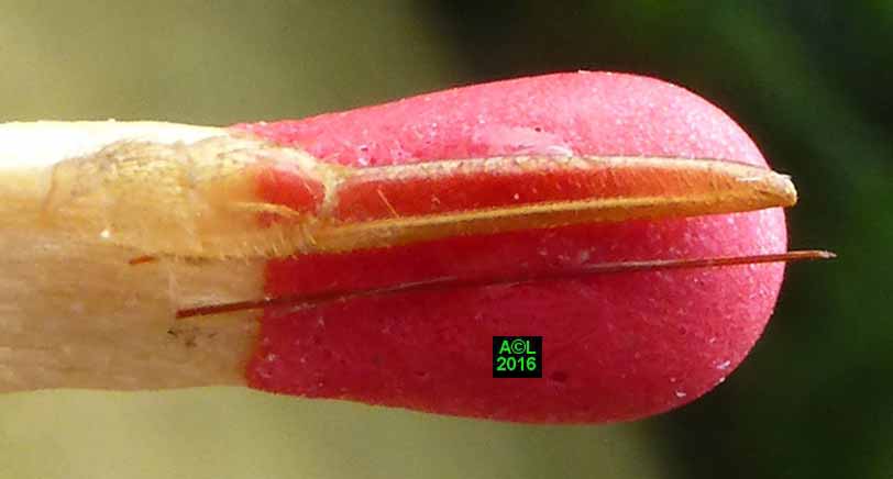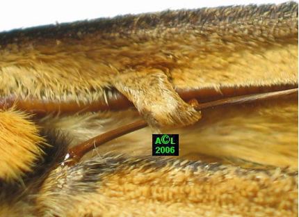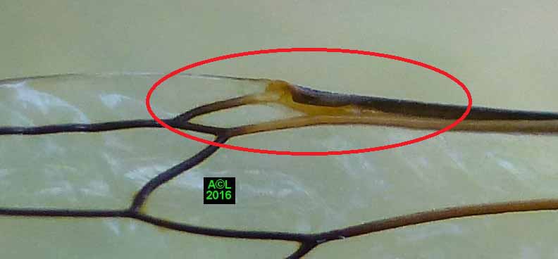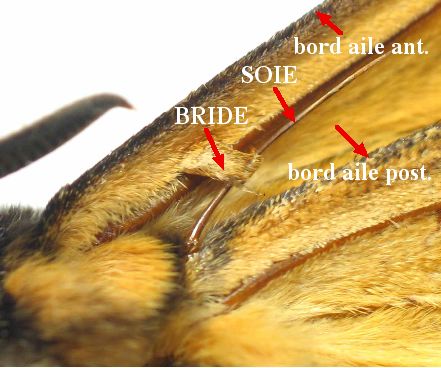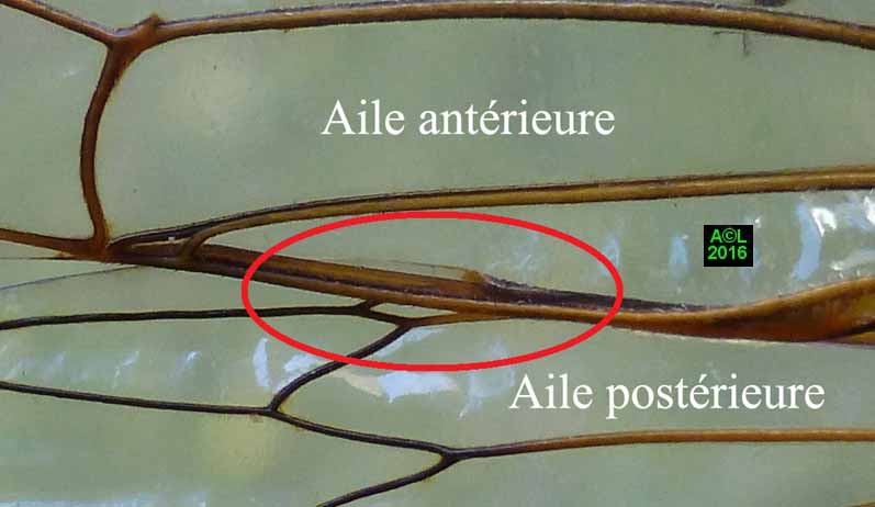 Sensiblement située au milieu de la nervure antérieure de l'aile postérieure, cette gouttière se clipse sur une zone "faite pour" de la nervure postérieure de l'aile antérieure. Vous noterez que le clipsage est très librement coulissant, d'où une parfaite adaptation aux mouvements alaires induits par les évolutions aériennes de la bestiole..