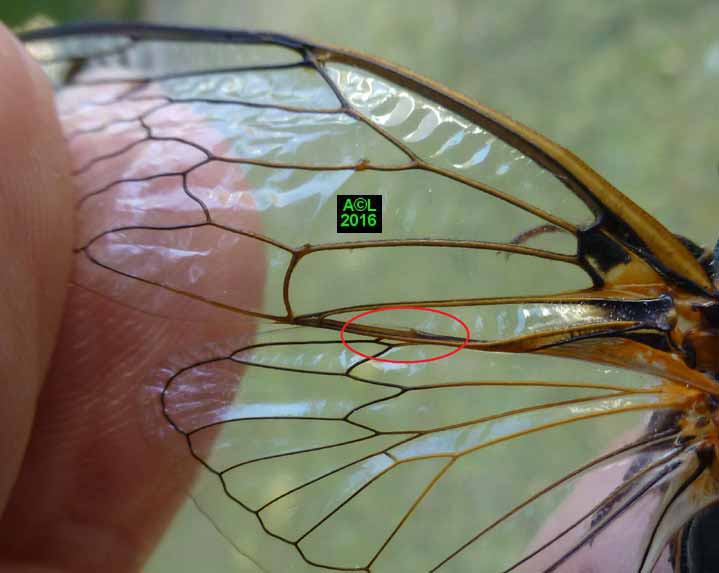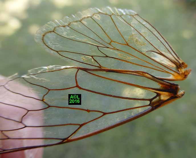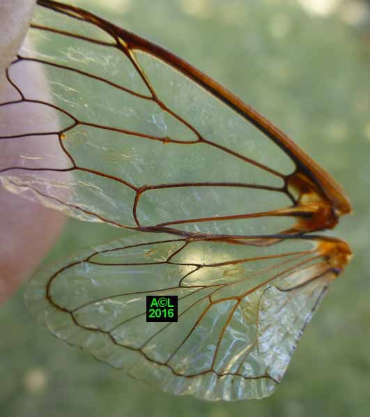 Les cigales étant des insectes très "massifs", leurs ailes sont amples, robustes, et solidement nervurées. Afin d'améliorer la qualité du vol, le couplage des ailes antérieures avec les postérieures a été prévu par Dame Nature, possibilité au demeurant largement répandue chez les insectes. Les systèmes d'accrochages sont variés, toujours efficients, et parfois très originaux, tel le "joug" de certains papillons nocturnes. En la matière notre cigale fait particulièrement simple puisqu'il s'agit d'une courte gouttière fonctionnant sur le principe d'un "clip".