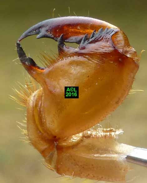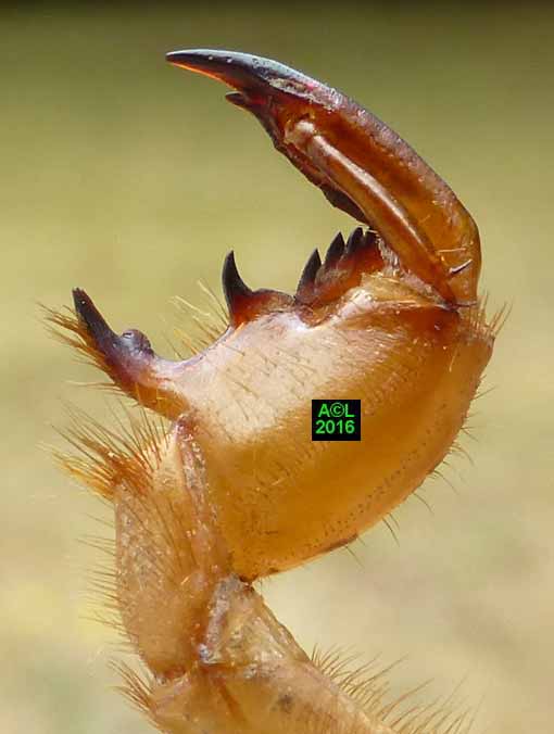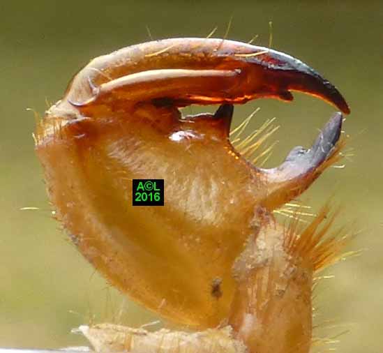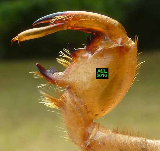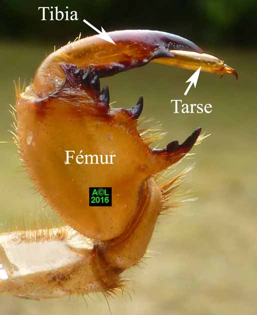 Pour finir vous noterez la petitesse du tarse, son articulation basale lui permettant de se rabattre contre l'éperon "tibial", et d'ainsi se protéger lors des "gros travaux" (creusements par exemple). En pratique ces tarses finissent souvent amputés, mais leur rôle confinant l'accessoire cela ne prête pas à conséquence, d'autant qu'un tarse "tout neuf" prendra place lors de la mue suivante.