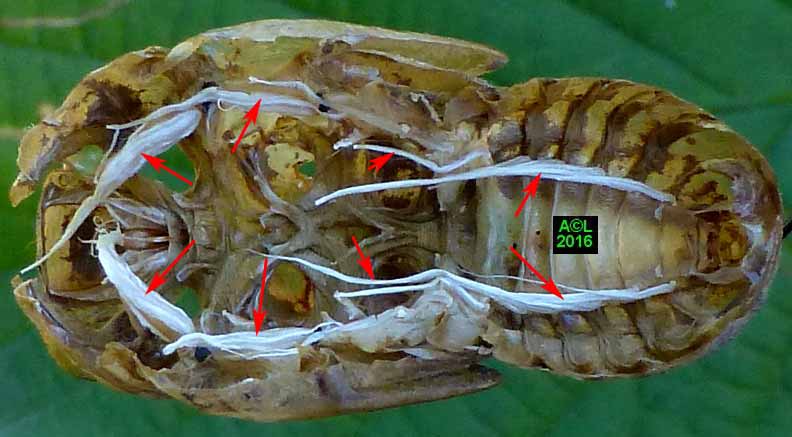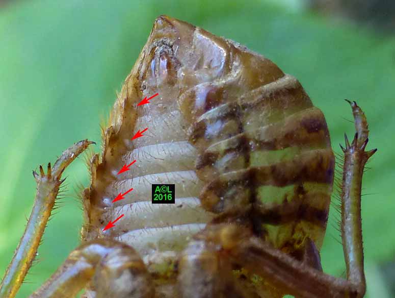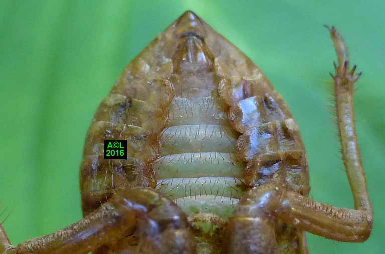 Appel à spécialistes "es cigales" : bien visibles ci-dessus, car plus clairs, plus minces, et différemment structurés, les segments abdominaux ventraux (= sternites) proprement dits présentent la curieuse particularité d'être nettement "hydrophobes" (et cela en dépit de l'ancienneté du "stockage" de ces exuvies). Sauf à considérer qu'il s'agit de la "gouttière urinaire" précédemment évoquée, hypothèse me semblant plausible, j'avoue ignorer la raison d'être de cette particularité ... d'où mon appel !