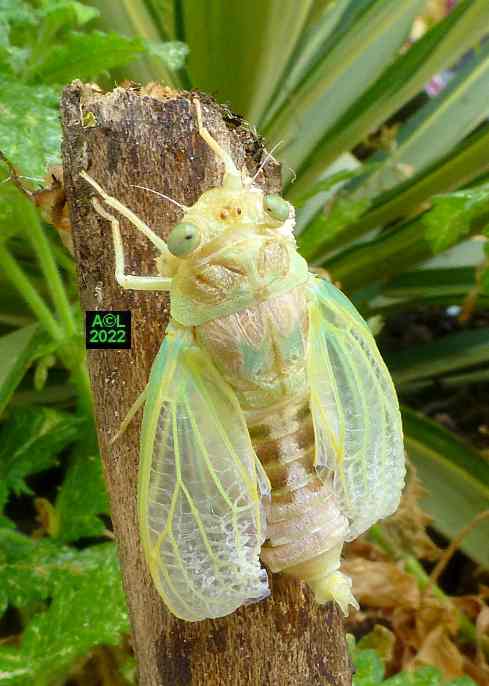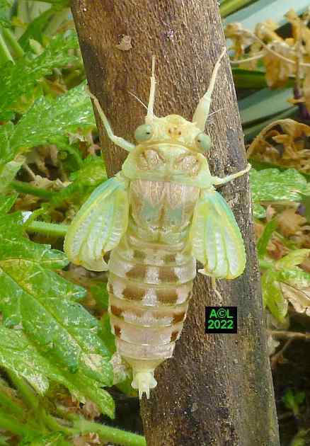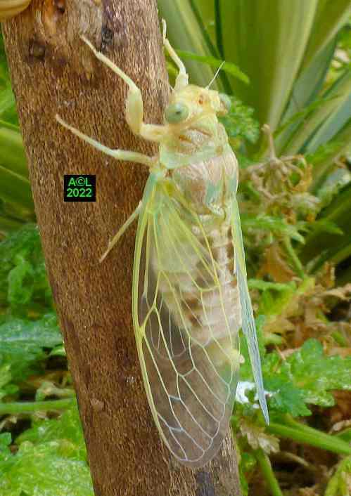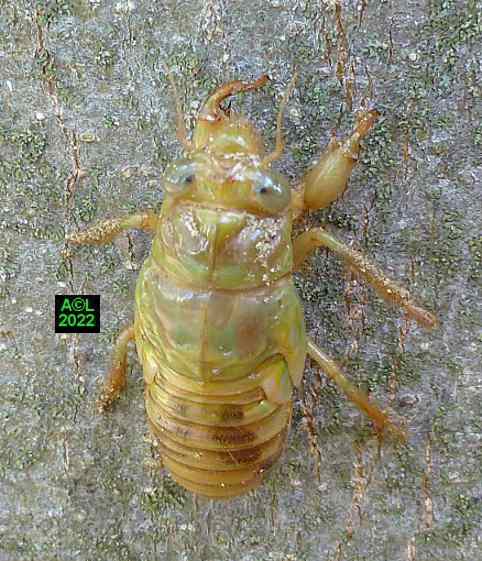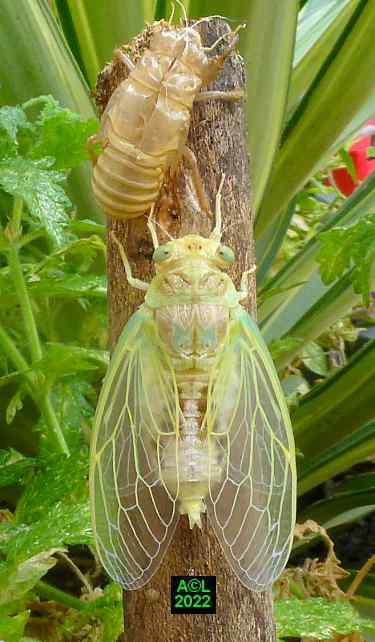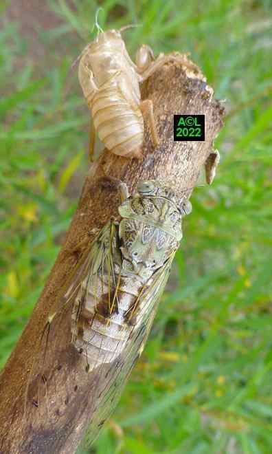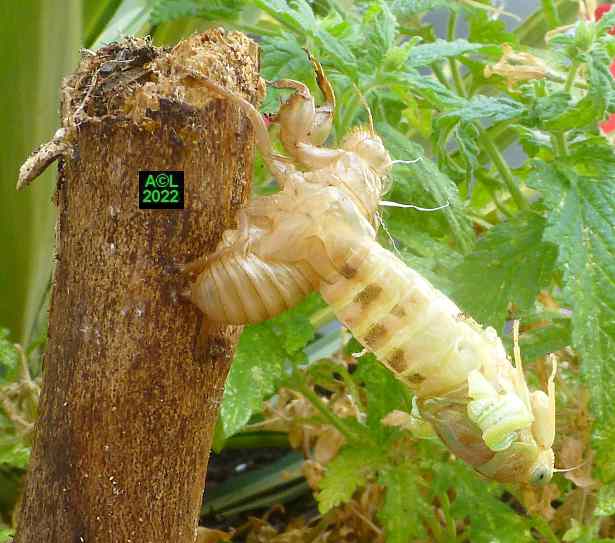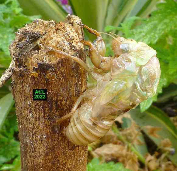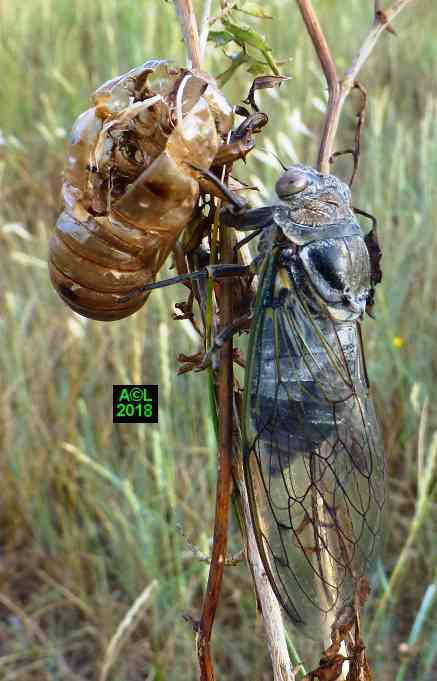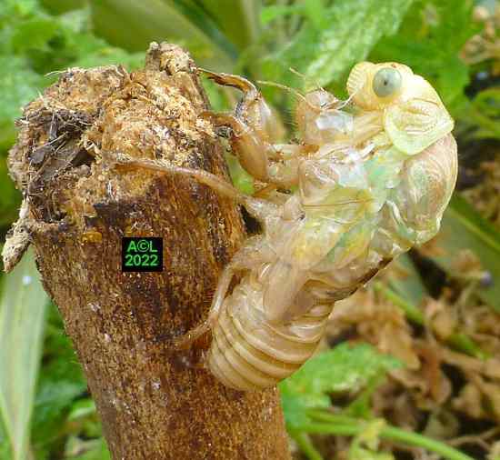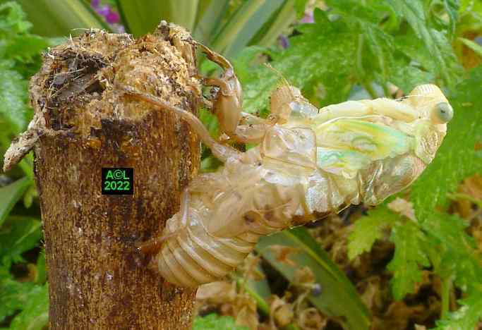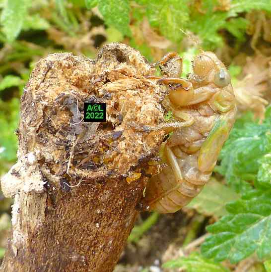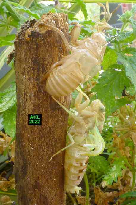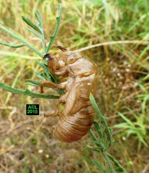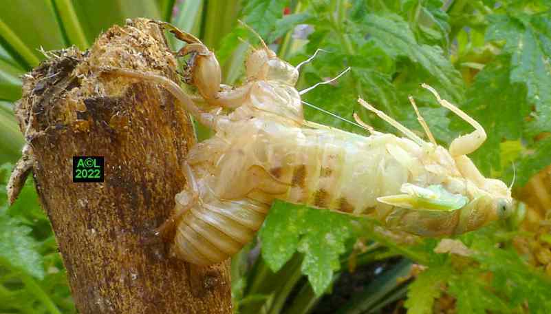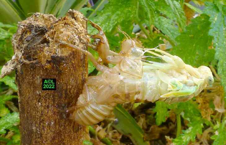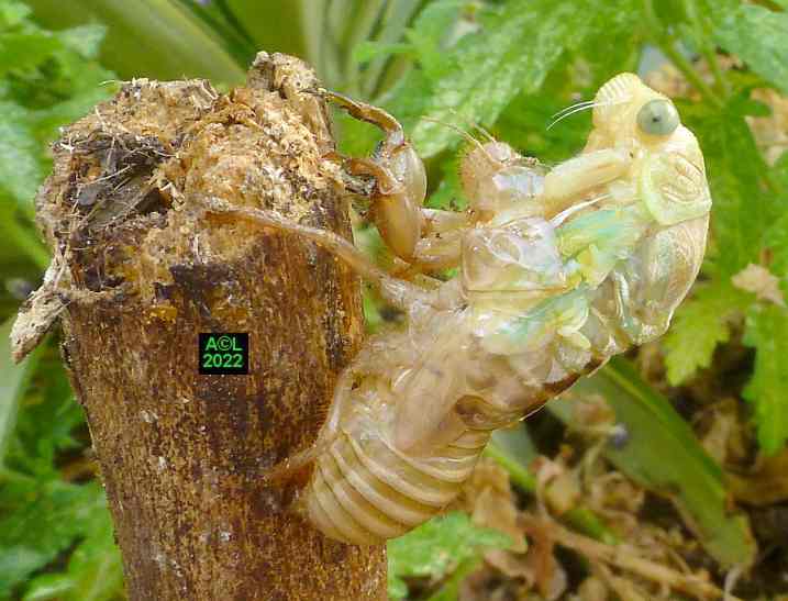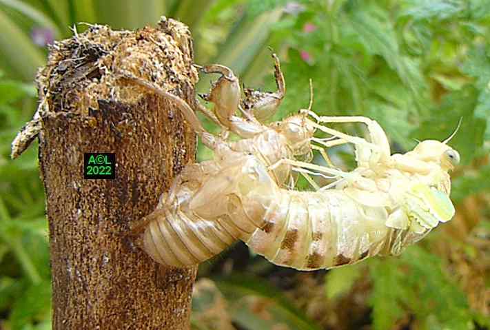 L'ouverture ainsi générée va permettre l'émergence progressive de l'insecte adulte. Allant de paire la coloration définitive et le durcissement des téguments feront suite, le processus demandant plusieurs heures. A terme la bestiole s'en ira vivre sa vie ( telle que prévue par Dame Nature ! ) et entre autres "chanter" (cigale oblige ! ) si c'est un mâle !