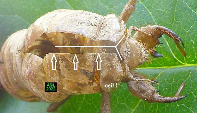 Très schématiquement la sécrétion du bien nommé liquide exuvial va permettre le décollement de la future ... exuvie ! (terme plus approprié que "mue"). Dans le même temps l'augmentation de la pression "sanguine" (et donc de l' hémolymphe), conjuguée à celle de l'air absorbé, va provoquer la rupture du tégument thoracique larvaire, selon une ligne médiane dorsale, brièvement prolongée en "y" en avant des yeux, comme l'illustration ci-dessous le montre.