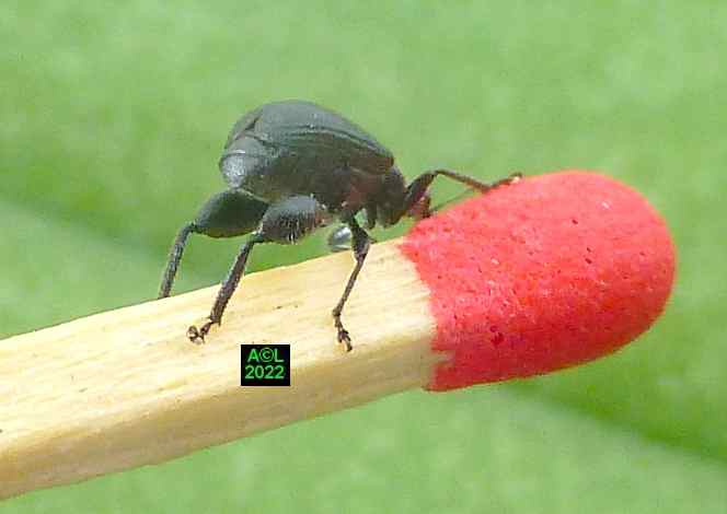 Comme déjà dit, la bestiole est entièrement noire, très petite, et la traditionnelle allumette permet d'en juger. Le mâle se distingue aisément par l'ampleur de ses fémurs postérieurs lesquels valent largement les biceps du célèbre "Popeye". Reste que tout le mérite de l'ouvrage revient à la femelle, le minuscule insecte montrant pour ce faire d'une force très inattendue, et d'un savoir-faire qui pour être instinctif n'en surprend pas moins ... et cette "page entomo" en témoigne !