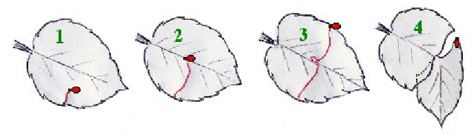 A noter encore que le "mâchouillage" de la nervure centrale va tarir le flux de sève, parachevant ainsi le processus de flétrissement du végétal, ce qui favorise évidemment l'enroulement du cigare, mais aussi son dessèchement ultérieur, et à terme sa chute. Le découpage se fait toujours sur le dessus de la feuille, le plus souvent de gauche à droite, la bestiole se placant toujours sur la partie qu'elle découpe. Vous noterez également qu' elle se positionne, toujours là encore, perpendiculairement à la coupe, d'où son déplacement latéral (en "crabe") au fur et à mesure de la découpe.