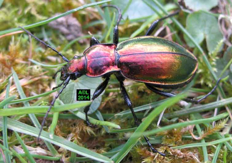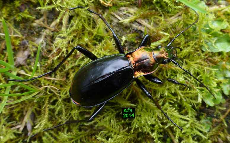 Dans une vieille canette de bière trouvée sur place, et recyclée illico en piège à carabes, il y avait un mâle plutôt petit, limite "racho", avec des élytres en grande partie noirâtres. La bestiole était manifestement peu ordinaire, mais aussi passablement "usée" par les aléas du métier de carabus, ce qui pouvait accréditer la thèse d'un mélanisme "mécanique" dit d'érosion, et donc sans intérêt, puisque résultant d'une simple abrasion des téguments ( sur les caillasses par exemple).