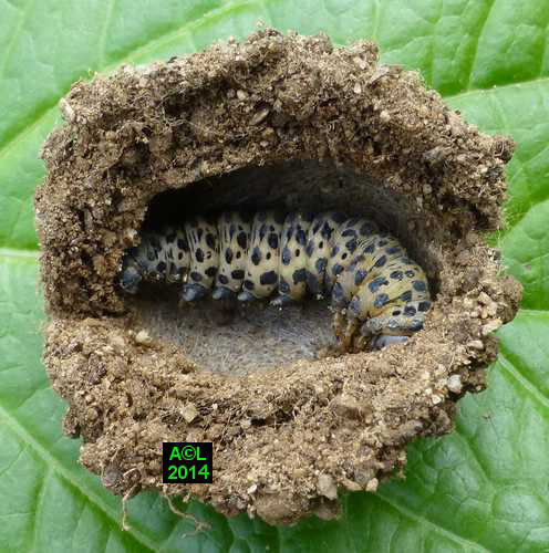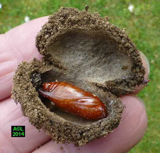 Là où d'autres affichent nettement la couleur ( en en changeant ! ), l'arrivée à terme de la chenille de cucullie se passe "incognito". La bestiole cesse simplement de s'alimenter, et se contente de quitter son "garde-manger" pour aller s'enterrer assez profondément . Dans un premier temps elle va aménager une logette à sa mesure et y tisser un cocon isolant fort épais, Dame Nature ayant semble-t-il prévu l'amplitude des écarts thermiques "encaissés" par la chrysalide. En effet le "coconnage" ayant généralement lieu en Juillet-Août, et les éclosions en Avril-Mai de l'année suivante, la chrysalide peut se voir soumise à des épisodes climatiques tant caniculaires que ... sibériens !