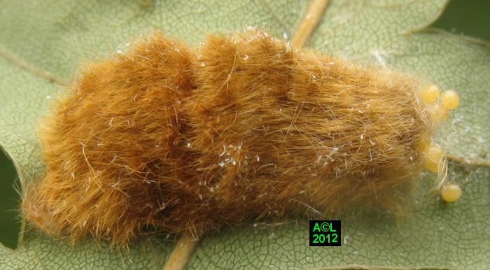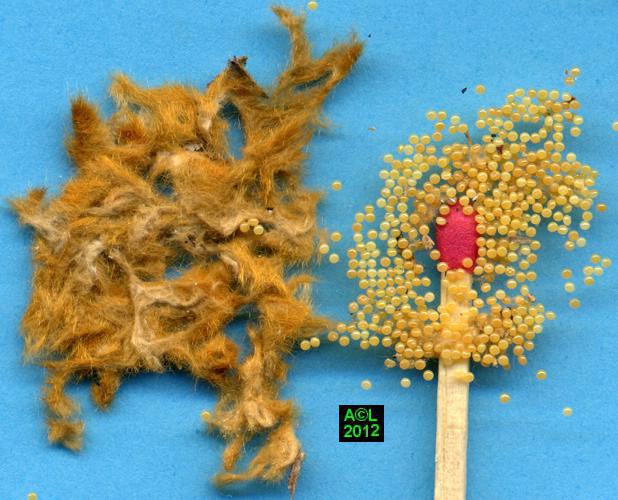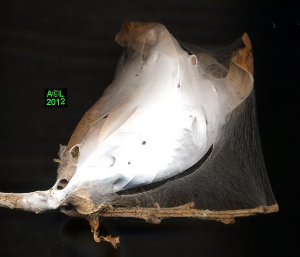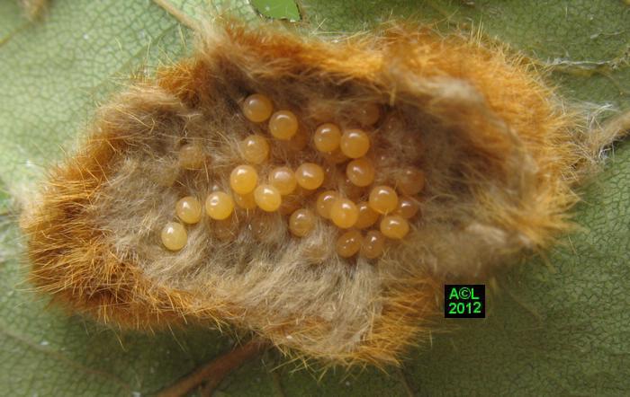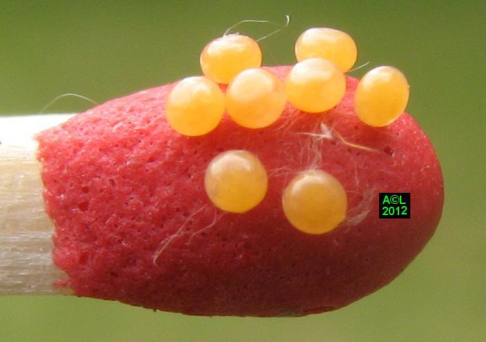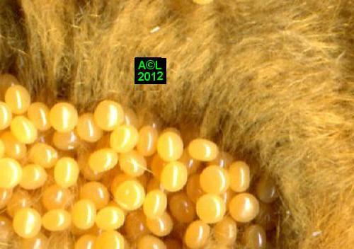 Curiosité et loupe binoculaire aidant, j'ai décortiqué aux "brucelles" et compté (bel excercice de patience ! ) une grosse ponte de 3 cm de long, laquelle comportait 592 oeufs. A noter que le chorion (= "coque") est manifestement résistant (et moi pas trop maladroit !), car 2 oeufs seulement s'en sont trouvés cassés !!!