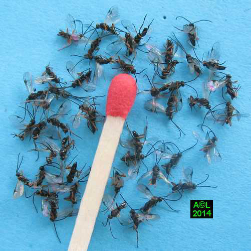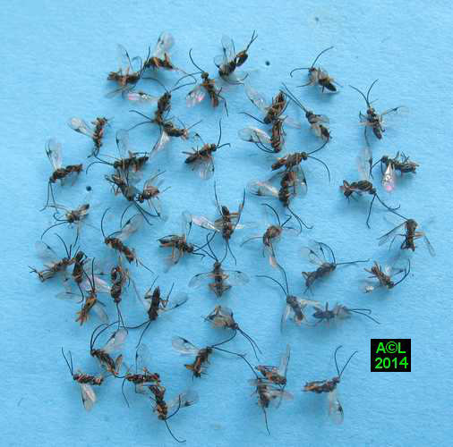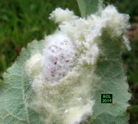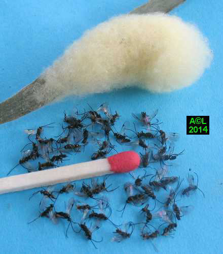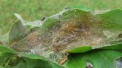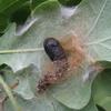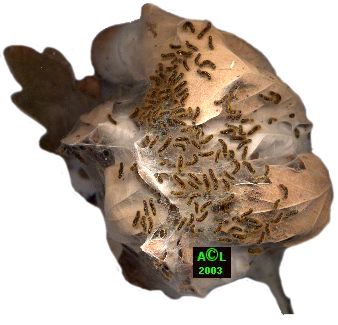 (*) Je pense qu'il s'agit d'oeufs "prêts à éclore", l'armature des crochets buccaux (noire) étant nettement visible par transparence (sous binoculaire). J'ajouterais que les "oeufs" sont extrêmement petits en raison même de l'importance de leur nombre, et plus encore de la petitesse des chenillettes attaquées.