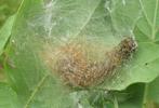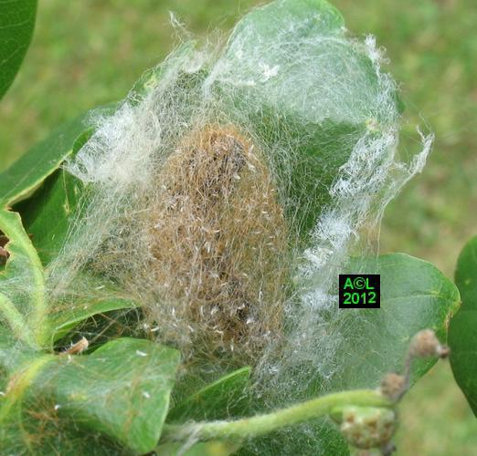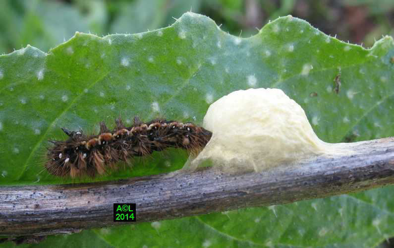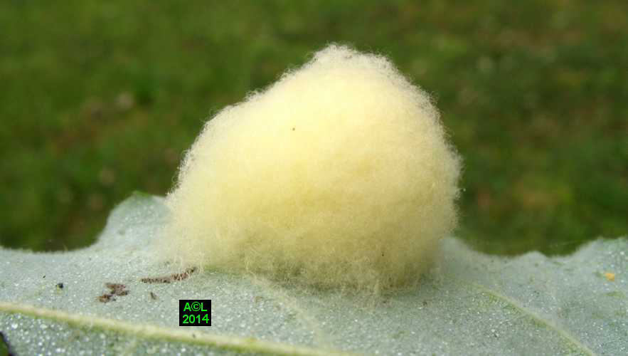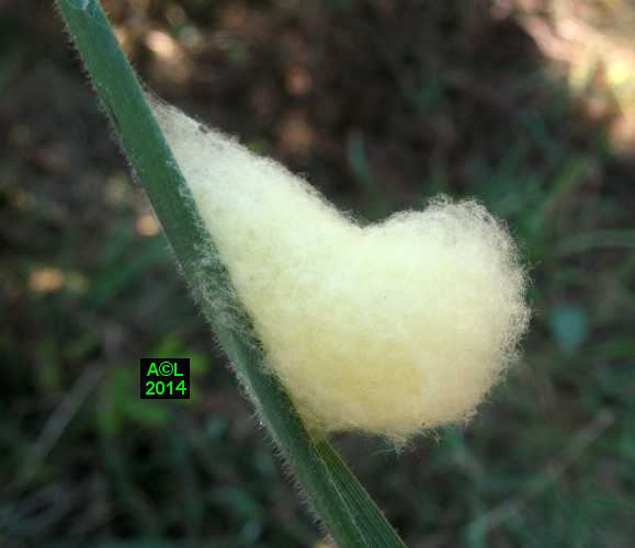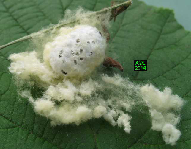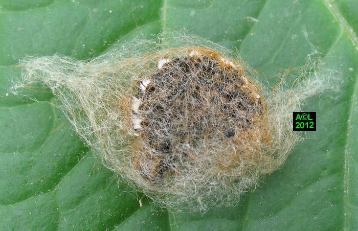 Sitôt émergées des entrailles de la chenille, les larvules parasites vont alors opter pour la formule ... "lotissement" ou "HLM" ! Suivant les espèces d'Apanteles, les cocons sont en effet tissés individuellement ( tout en restant "groupir" ! ) ou au contraire rassemblés au sein d'un cocon collectif. Par son aspect et sa texture ce dernier genre de cocon ressemble à s'y méprendre à une ponte d'araignée, et c'est encore plus vrai quand la dépouille de la chenille se désolidarise et tombe à terre, cas de figure le plus habituel.