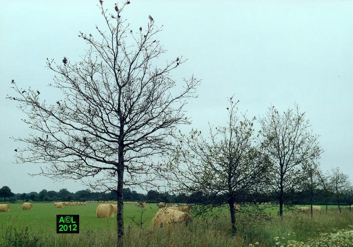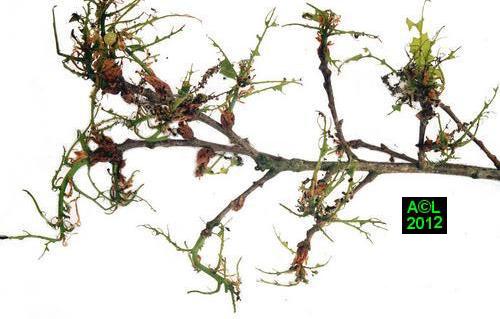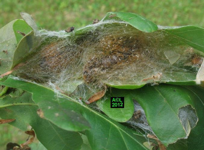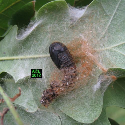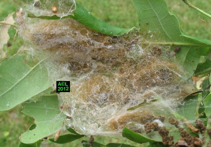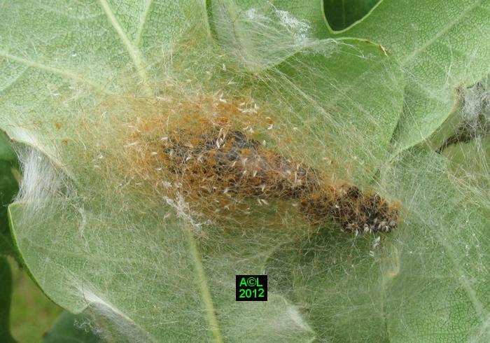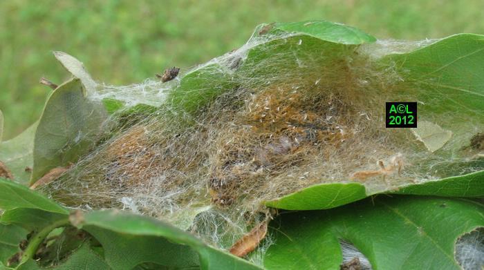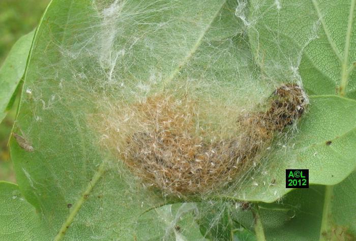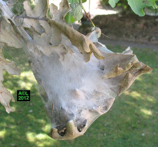 Cela précisé, imaginez un tout jeune nid estival de "cul-brun", tissé à l'extrémité d'une branche basse de l'un de mes chênes, et une mouche tachinaire venant y parasiter les minuscules chenilles. L'occasion était trop belle ( et même exceptionnelle ! ), pour ne point la saisir, mais pour 3 minutes de vidéo il m'a fallu 3 jours de guet ... et des ruses de sioux ! Tenu d'une main l'APN prenait en effet appui sur un fer à béton planté dans le sol, l'autre main servant à courber ledit fer afin de suivre au plus près (quelques cm) les évolutions de la tachinaire en veillant bien sûr à ne point l'effaroucher ! Autant dire que la corbeille de l'ordi n'a pas chômé.