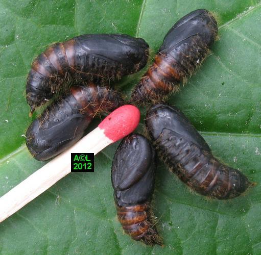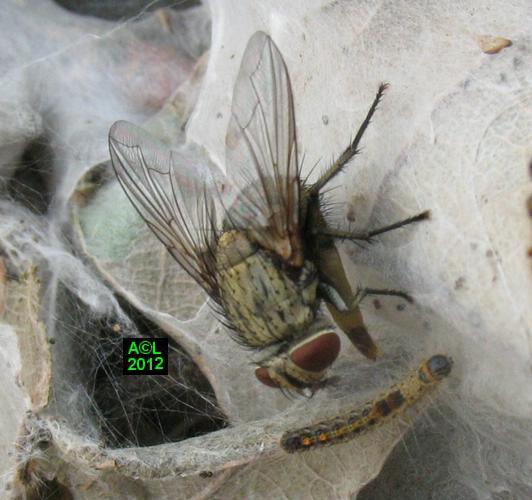 Comme vous le verrez, la femelle tachinaire dispose d'un imposant ovipositeur "télescopique" terminé par un stylet . La peau de la jeune chenille s'en trouve perforée, et dans le même temps l'oeuf ou la larvule (*) sont littéralement injectés. Le développement de l'hôte et du parasite vont de paire, ce dernier faisant en sorte de ne pas léser les organes vitaux de la chenille. Selon les espèces de tachinaires, la sortie de l'asticot et sa pupaison se font quand la chenille arrive à terme, ou quand elle s'est chrysalidée.