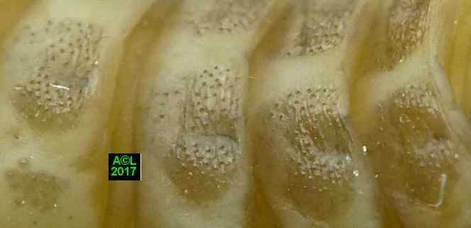 gauche : vue ventrale avec détail des "plages
