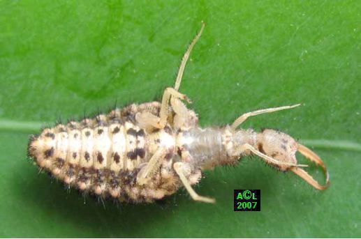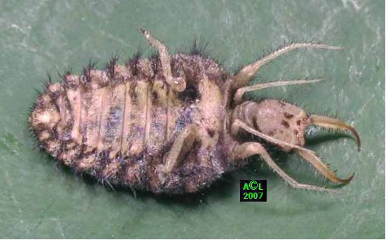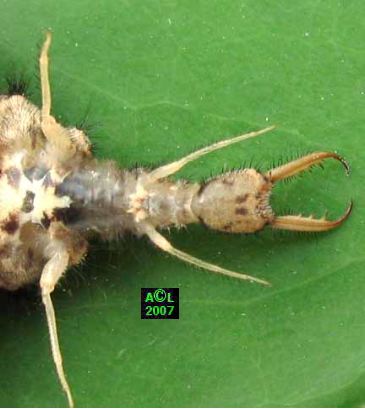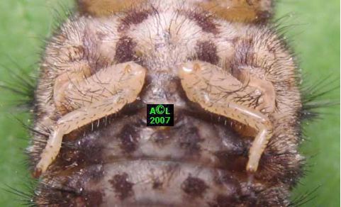 De fait les pattes antérieures sont courtes, grêles, quasi atrophiées, et dirigées vers l'avant à la manière de palpes ou d'antennes. Par ailleurs elles donnent l'impression d'être insérées entre les pattes intermédiaires, mais en fait cette impression résulte de l'invagination de la partie antérieure du corps, au demeurant très étroite, tel un cou (cf. cliché ci-dessus). Au final elles apparaissent bien peu fonctionnelles, d'autant que sur substrat lisse la larve se stabilise fréquemment en inclinant la tête et en s'appuyant sur l'extrémité de ses mandibules grandes ouvertes.