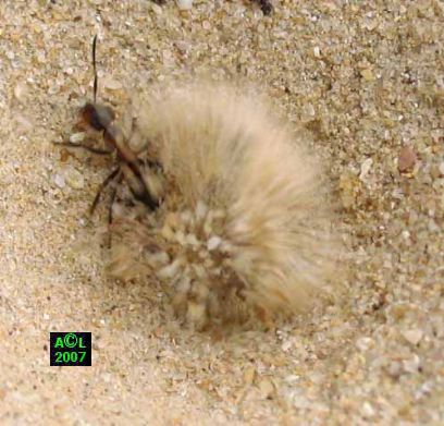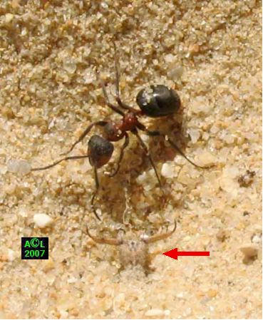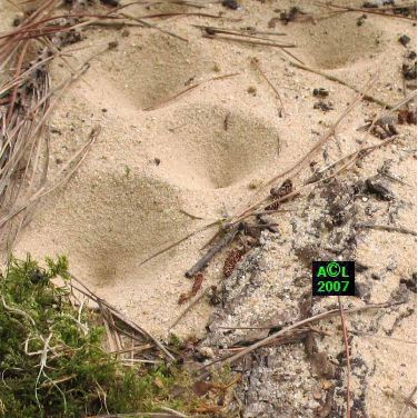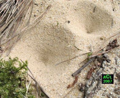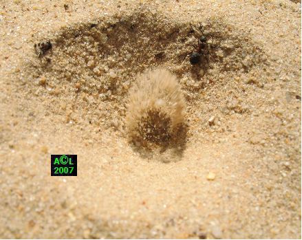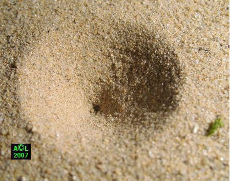 La larve du Vermileo, couramment appelée "ver-lion" (voir page entomo, rubrique "autres") a des moeurs très comparables à celles de notre Fourmilion. Les entonnoirs sont cependant nettement plus petits ( de l'ordre de 2 cm maxi ), et moins évasés, avec un fond sensiblement arrondi. Ils sont construits dans les zones très abritées, ombragées, avec substrat sablonneux ou poussiéreux.