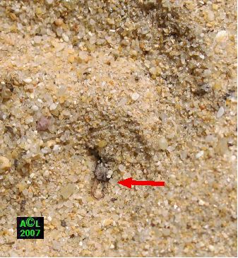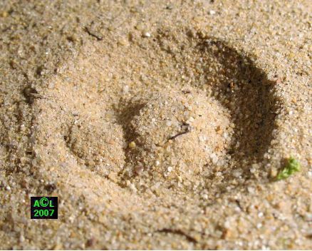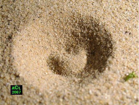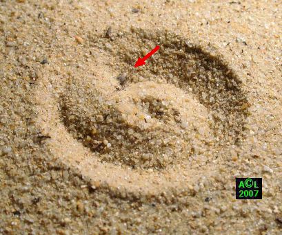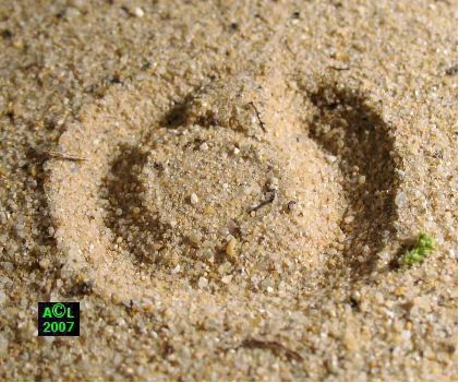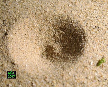 Reste que les faits sont indéniables et que la curieuse bestiole semble pouvoir "tamiser" le substrat à son gré car les entonnoirs sont toujours constitués des particules les plus fines. En réalité, gravitation aidant, tout ce qui n'est conforme à la granulométrie souhaitée par la larve (menus cailloux, débris en tous genres) est tout simplement balancé "par-dessus bord" au fur et à mesure du cheminement de la larve, et donc du creusement de l'entonnoir.
