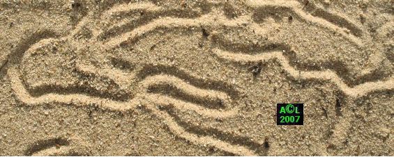 Dans un premier temps la larve s'ensable très superficiellement si elle a été extraite, ou elle remonte sous la surface du sable si l'entonnoir a simplement été comblé. Quand elle le décide, et tout en restant à couvert, la bestiole commence par décrire des cercles de l'ordre de 2 à 3 cm de diamètre, le mouvement du sable témoignant très nettement du trajet suivi, et ce jusqu' à la fin du "chantier". La progression se fait bien sûr en "marche arrière", presque toujours dans le sens inverse des aiguilles d'une montre, et le sens de rotation choisi est conservé jusqu'à la fin.