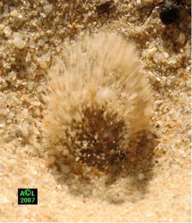Le plus souvent l'observation porte sur des entonnoirs en quelque sorte provisoires, car bien souvent creusés dans l'urgence d'un déterrage intempestif . Brutalement mise au jour la bestiole ne songe alors qu'à fuir, et donc à s'enfouir. Une fois à couvert, et si je puis dire rassurée, elle se contente d'éjecter le sable à coups de tête, et par gravitation il s'ensuit la formation d'un entonnoir qui pourrait se qualifier de " secours ", ou encore de " simplifié " eu égard à la méthode et au résultat.