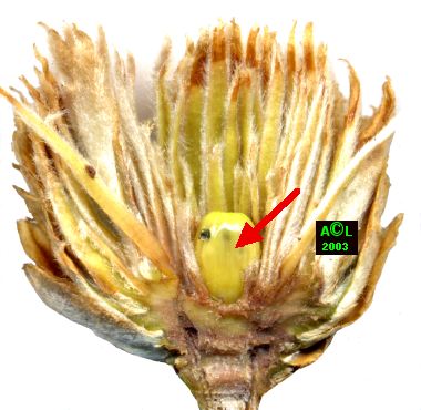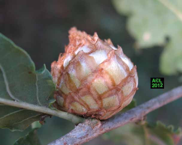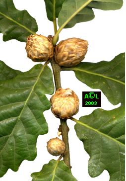 d'Andricus fecondatrix (fin septembre); au centre: logettes