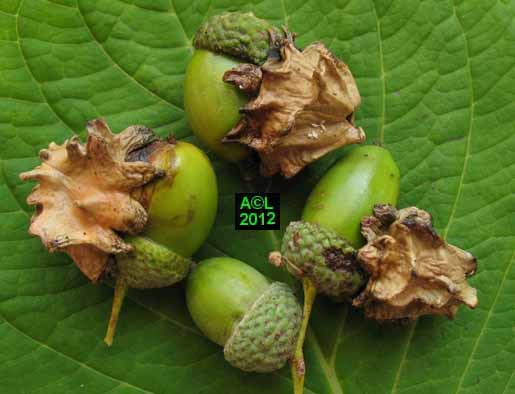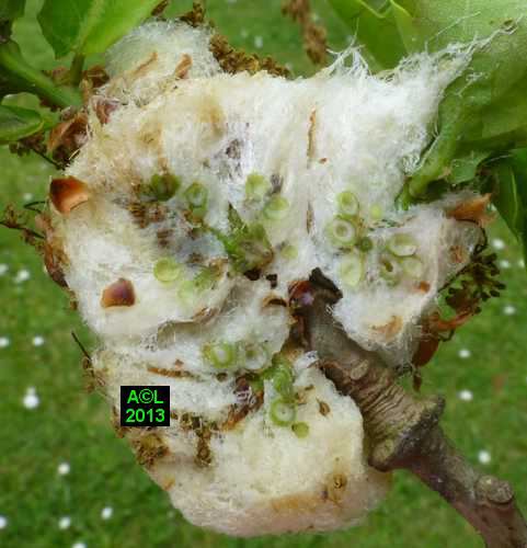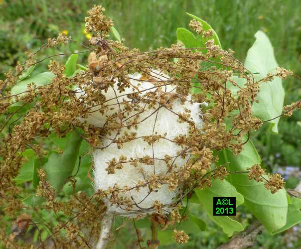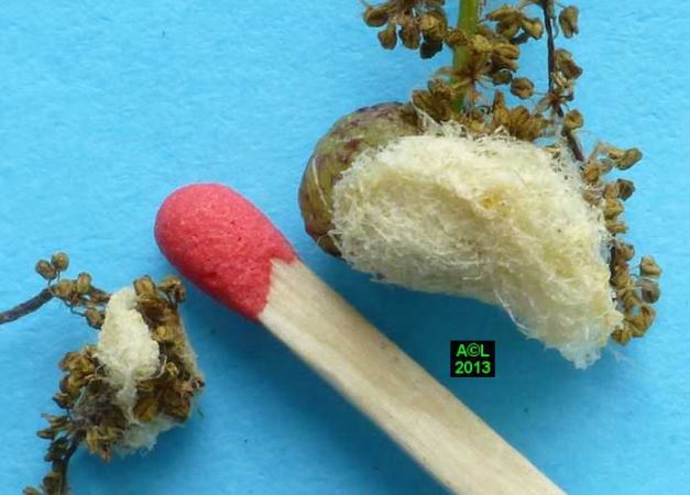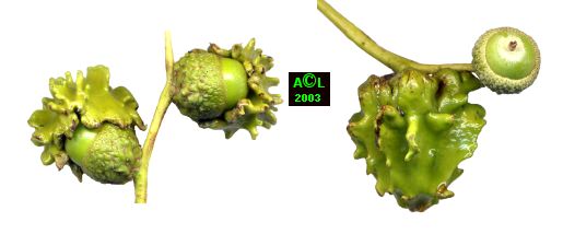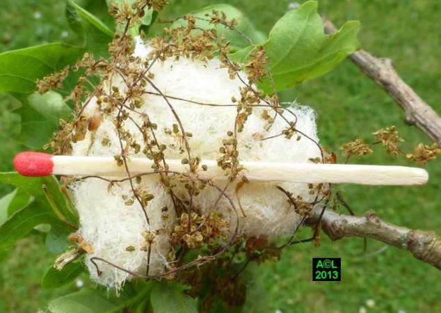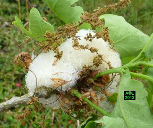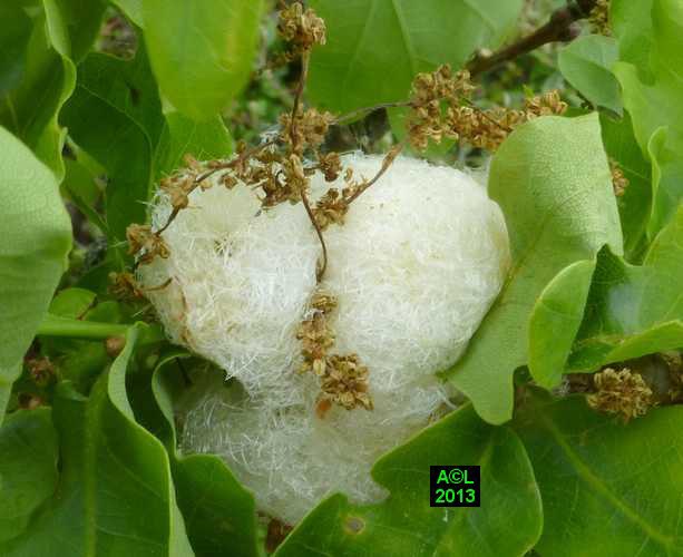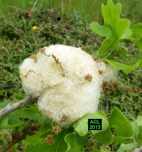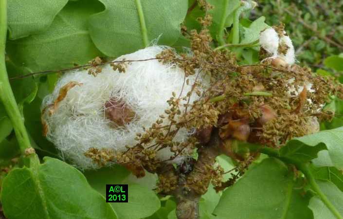 Alerté par un voisin venant d'élaguer un chêne, au demeurant fort tardivement (mi-Mai), je suis allé voir ce qu'il décrivait comme des "boules de laine de mouton". J'ai ainsi découvert les fameuses et peu fréquentes "galles cotonneuses" d'Andricus quercusramuli ... une première pour moi ! ... et une p'tite dernière pour le site !