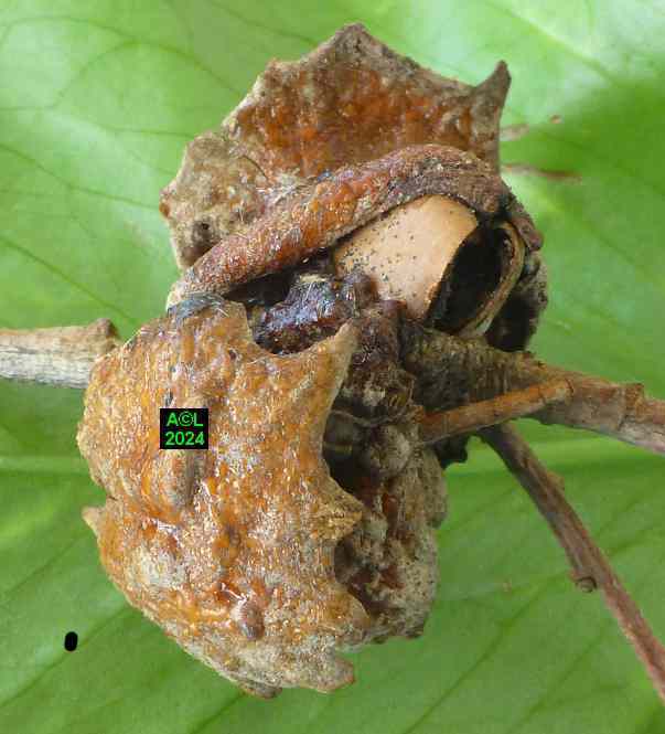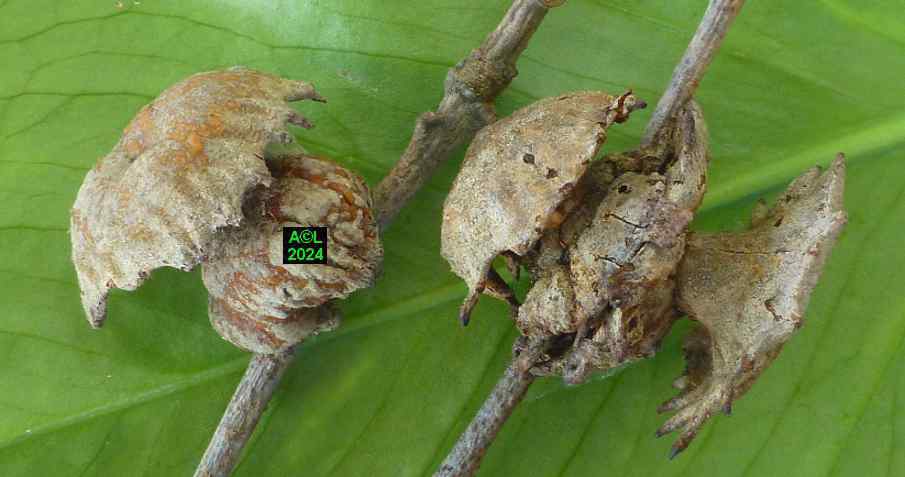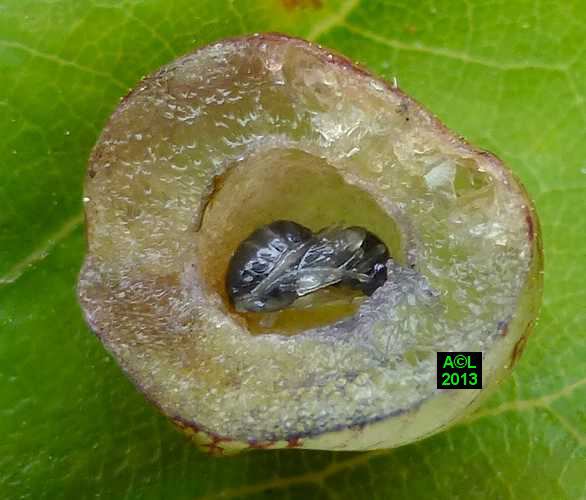 Comme vous le verrez, cette galle est "multi-loges", là où de nombreuses espèces hébergent un seul locataire. En toute logique les "galles HLM" sont généralement plus volumineuses, à l'instar des "pommes de chênes" (Biorhiza pallida), mais comme toujours il est des exceptions, telle la sphérique et robuste Andricus quercustozae qui atteint 35mm de diamètre, et abrite une seule logette en son centre.