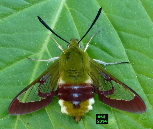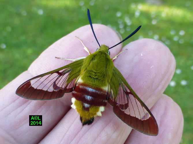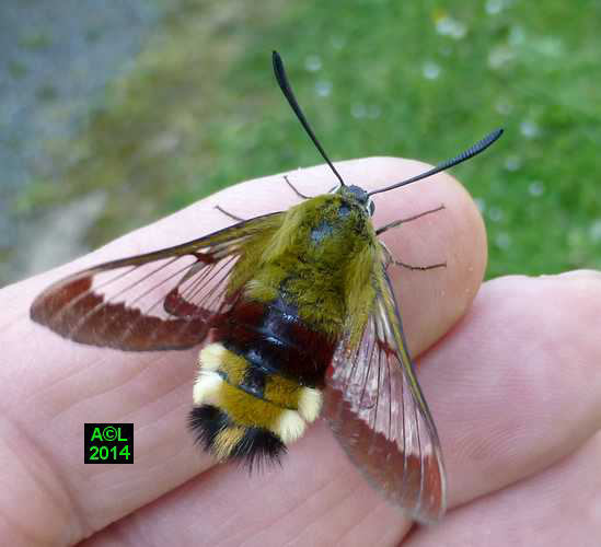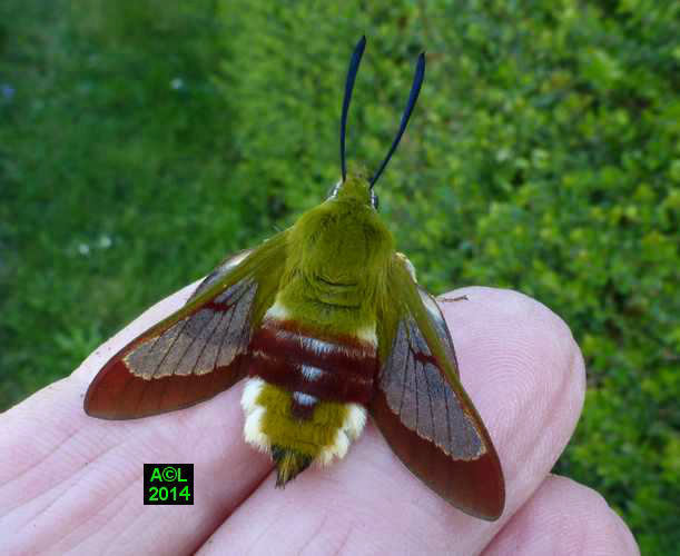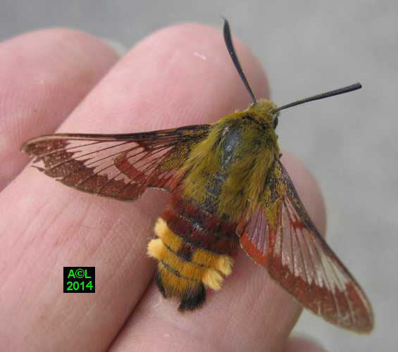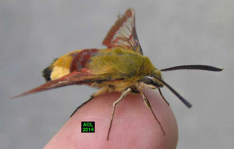 Nettement moins fréquent que son cousin le Moro-sphinx, le "Gazé" doit son nom commun à la transparence de ses ailes. L'appellation scientifique fait quant' à elle référence à la bordure rougeâtre desdites ailes (Hemaris), et d'autre part à l'abondante pilosité de la bestiole, laquelle lui donne un aspect "en forme de bourdon" (fuciformis).