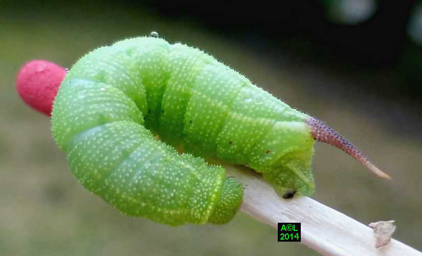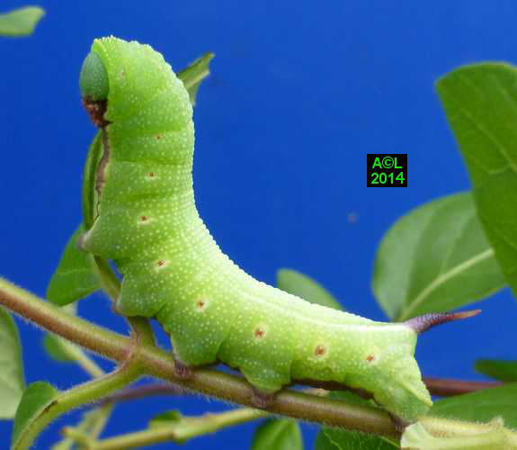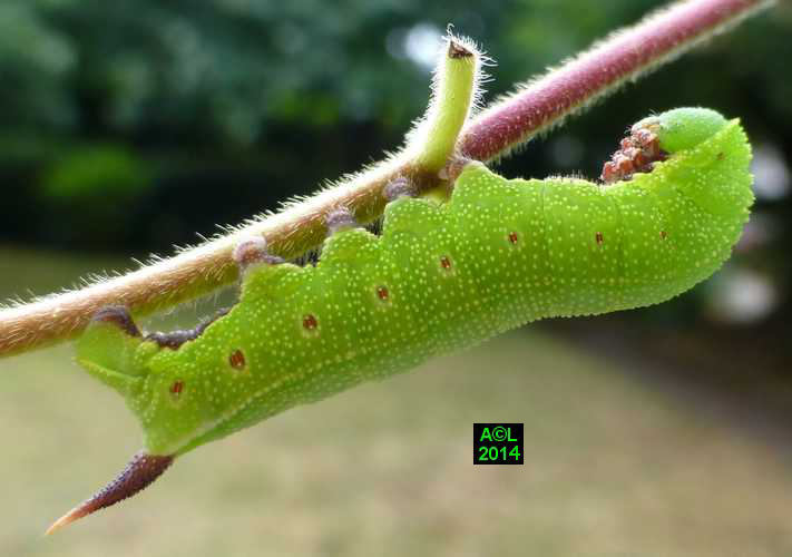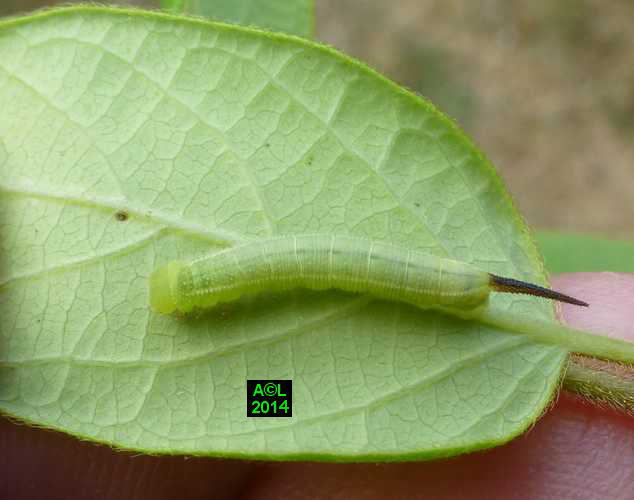 La chenille du Sphinx gazé (35 mm à maturité) se développe principalement sur les chèvrefeuilles et autres camérisiers, d'où l'appellation ( peu usitée ! ) de Sphinx du chèvrefeuille. Compte tenu de sa coloration , entièrement verte, et de la volubilité de sa plante nourricière de prédilection, cette chenille est très difficilement repérable "in natura", d'autant qu'elle se tient le plus souvent sous les feuilles. Compte tenu de son cycle de développement cette chenille est observable de juin à août, puis de septembre à octobre pour la génération hivernante.