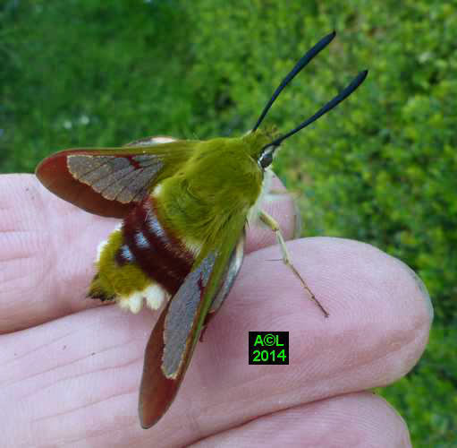 En regard de la coloration plutôt "tristounette" du Moro-sphinx, la livrée du Gazé se fait joliment polychrome et plus conforme au plumage souvent très coloré des colibris, également connus sous le nom d' "oiseaux-mouches". Pour finir vous noterez que le peu fréquent Sphinx bourdon (Hemaris tityus) complète le trio des sphinx précisément qualifiés de colibris en raison de leur petitesse et du vol stationnaire utilisé pour butiner.