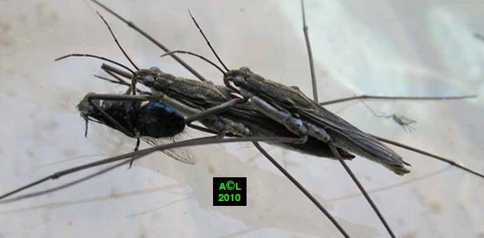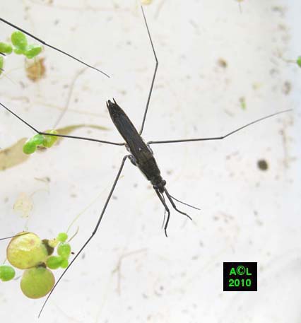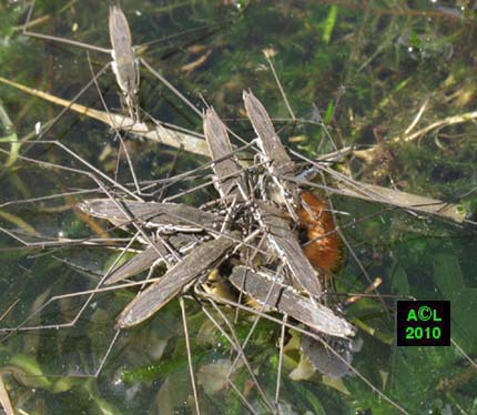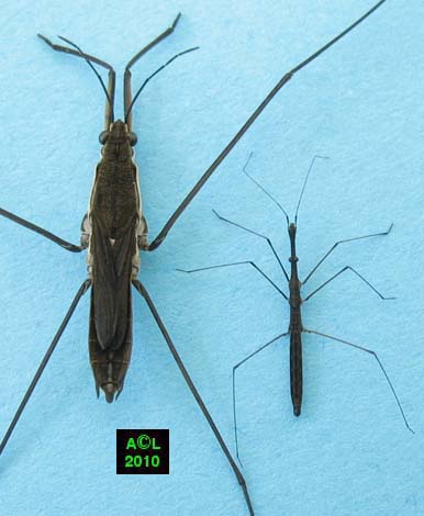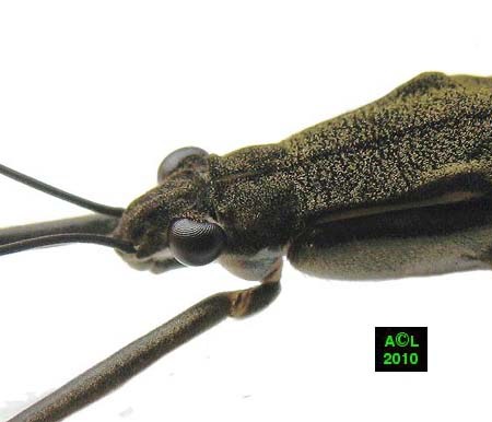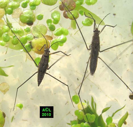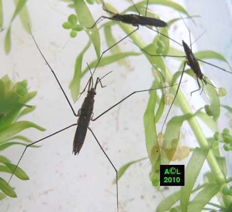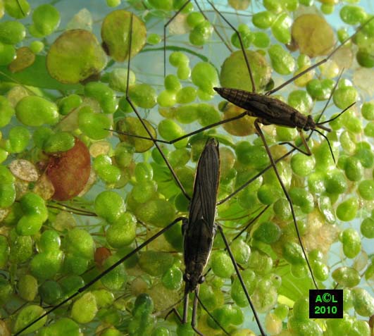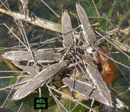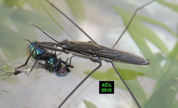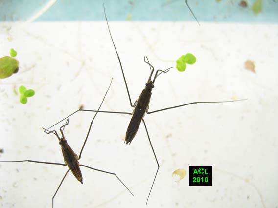 Toutes les punaises sont dotées d'un rostre apte à piquer et sucer, mais là où le régime phytophage prévaut très largement, les Gerris font partie du cercle restreint des espèces carnassières et donc prédatrices. A cet effet ils disposent d'un rostre puissant, véritable "poignard tubulaire" permettant d'injecter des sucs digestifs, puis d'aspirer les éléments nutritifs ainsi dissouts. Qu'ils soient morts ou vifs, les insectes et autres petits invertébrés tombés à l'eau constituent l'essentiel du menu. La préhension des proies est assurée par des pattes antérieures "faites pour", la très particulière locomotion étant le fait des membres intermédiaires et postérieurs ... non moins spécifiques comme vous le verrez !