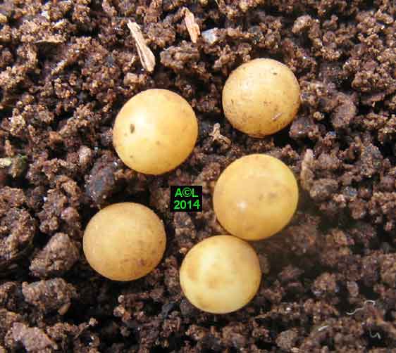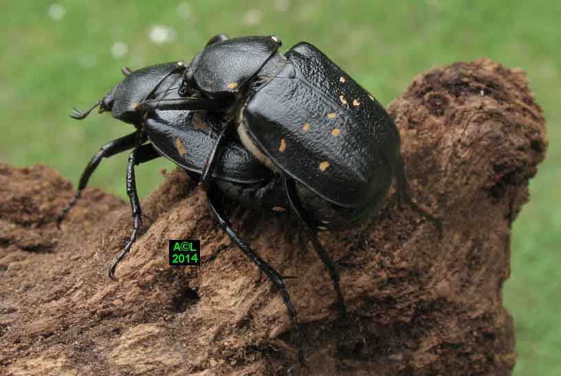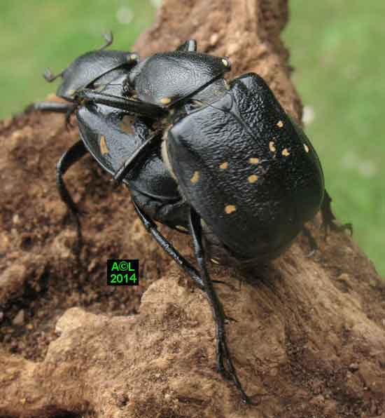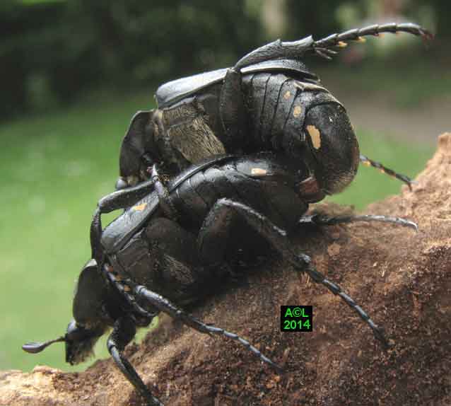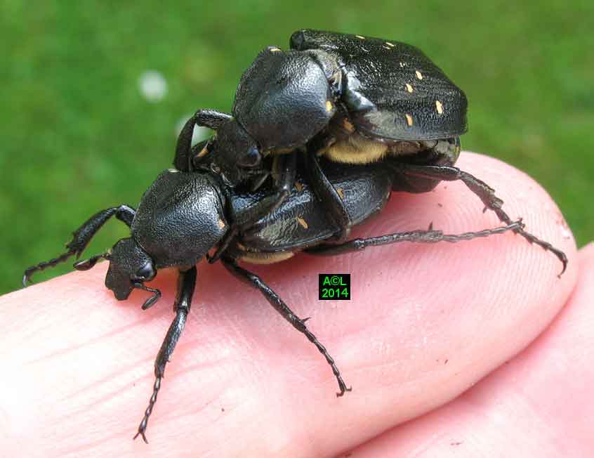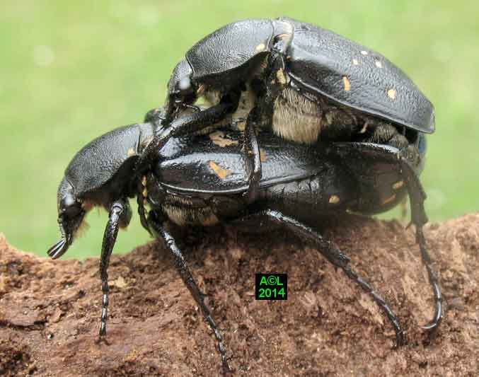 Dame Nature veillant à la pérennité des espèces, tout ce qui touche la reproduction va généralement bon train, et sitôt l'accouplement terminé les femelles de très nombreux insectes sont bien souvent aptes à pondre ... et ne s'en privent pas ! Présentement les femelles de Gnorimus s'enfoncent dans le terreau, souvent très profondément, et les oeufs y sont déposés au sein de logettes individuelles.