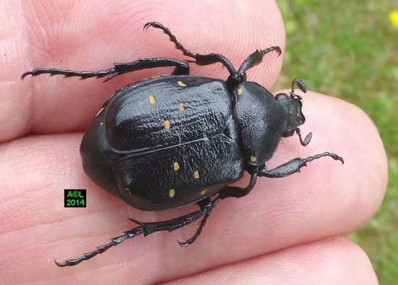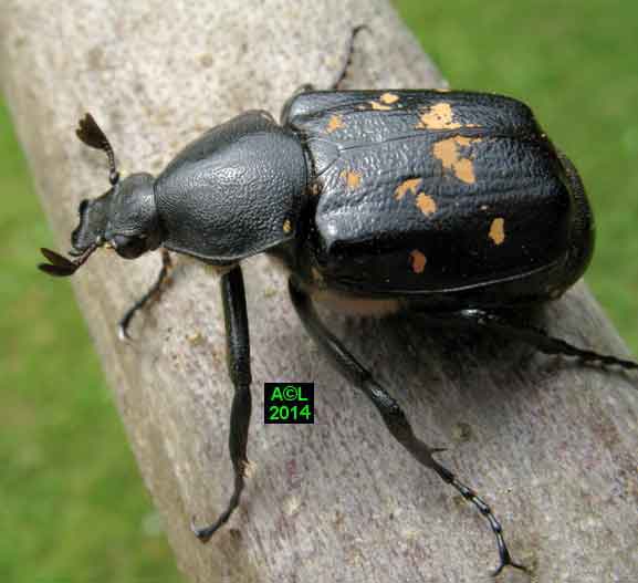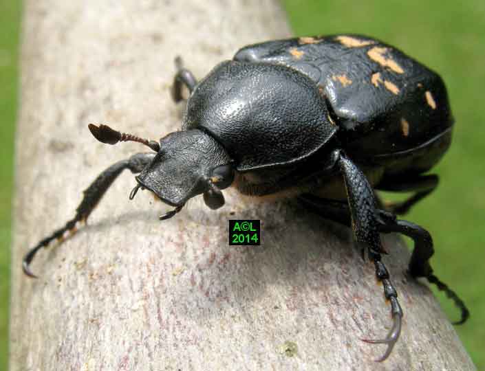 Par-delà son appartenance à la Famille des Cetoniidae (un peu plus d'une vingtaine d'espèces en France) cet insecte relève de la Sous / Famille des Trichiinidae, et à ce titre il voisine non sans raison avec le fameux "Pique prune" (Osmoderma eremita, voir site). Outre le fait d'affectionner des niches écologiques très comparables, les 2 bestioles sont véritablement des modèles de discrétion ... au grand dam des "chasseurs à vue". Ces 2 espèces se développent en effet dans le terreau garnissant les cavités des vieux arbres (Gnorimus se contentant d'un bien moindre volume), et rechignent à quitter leurs refuges, alors qu'elles sont parfaitement aptes au vol. Cela vaut plus encore pour le pique-prune qui ne butine jamais, là où notre Gnorimus est connu pour pouvoir le faire ... fort rarement il est vrai ! Quasi rituellement la littérature fait état du goût de la bestiole pour les inflorescences d'ombellifères, de sureaux, et de châtaigniers (dont les cavités sont d'ailleurs très appréciées par les cétoines ! ). Personnellement j'ai toujours débusqué ce Gnorimus à l'état larvaire, alors que son cousin le "Verdet" (Gnorimus nobilis) butine systématiquement, comme la Cétoine dorée ... et souvent avec elle !