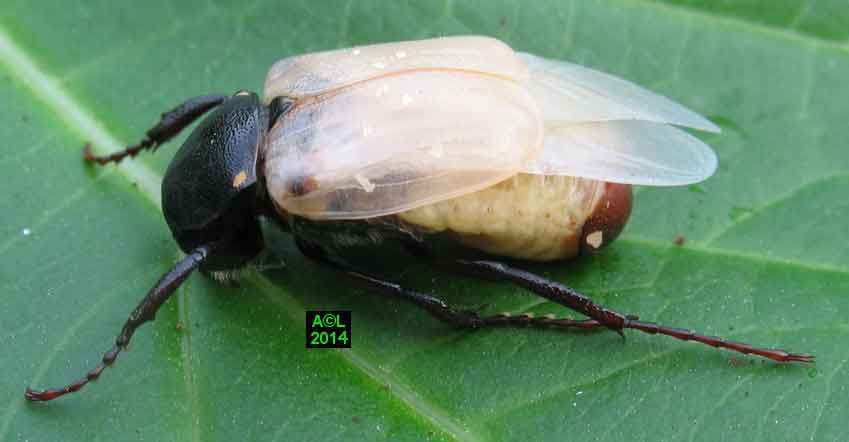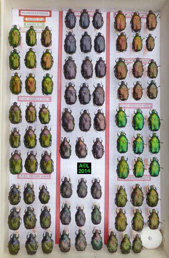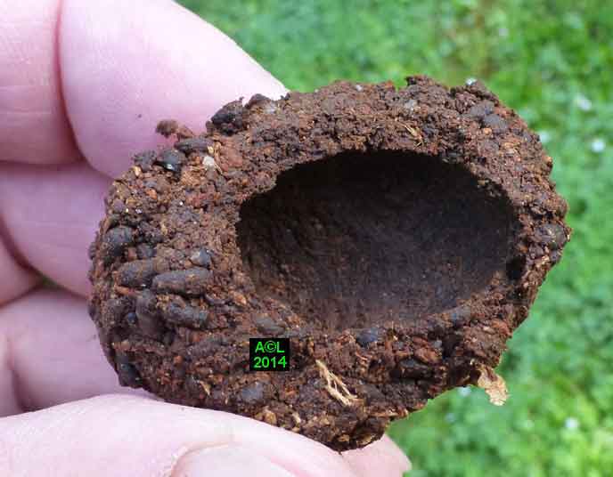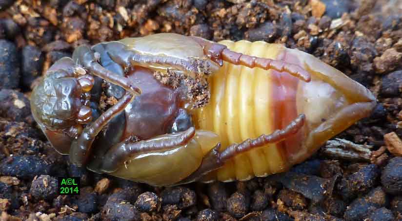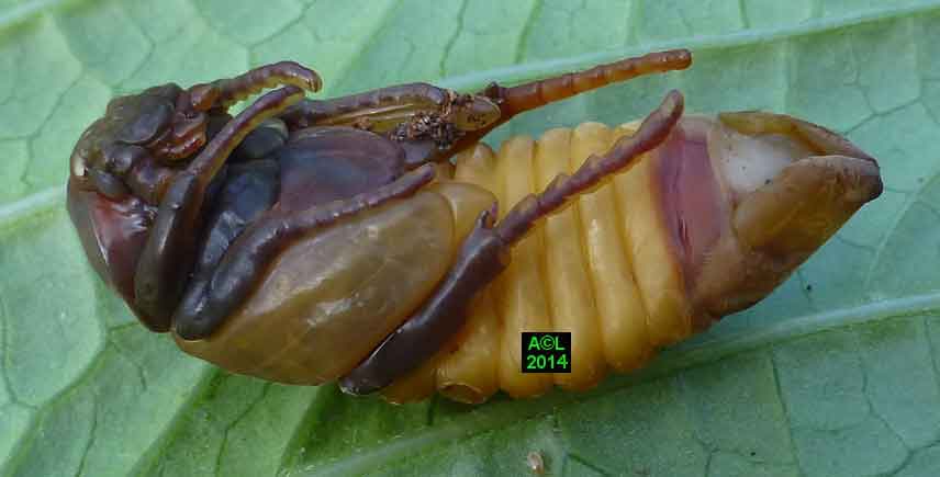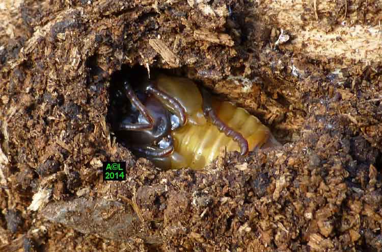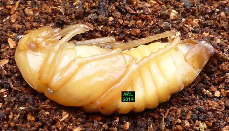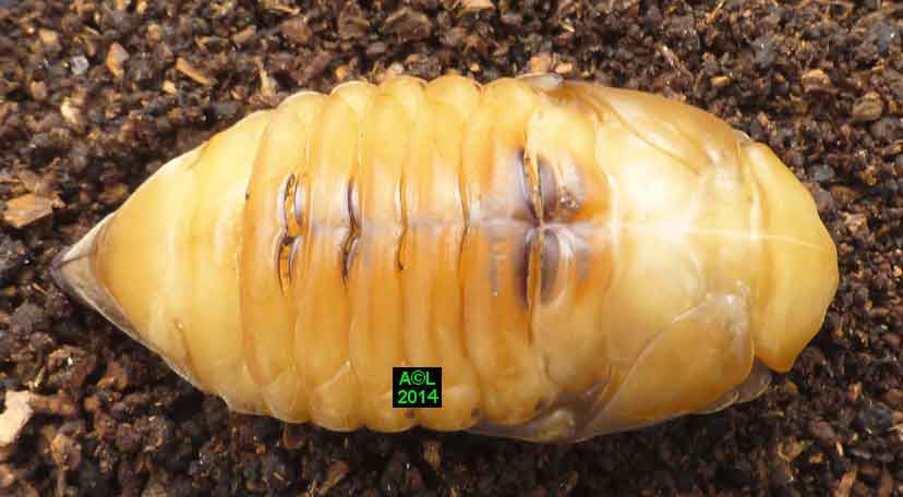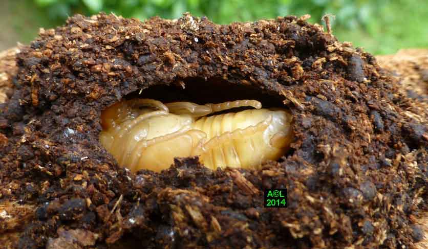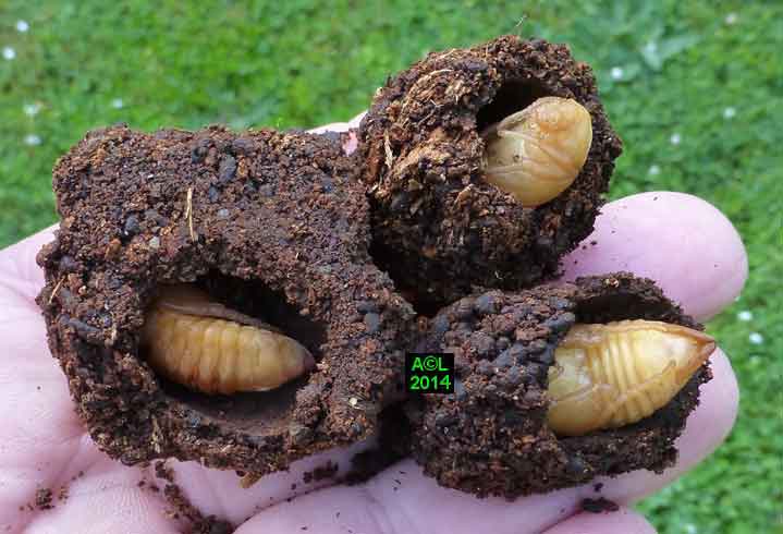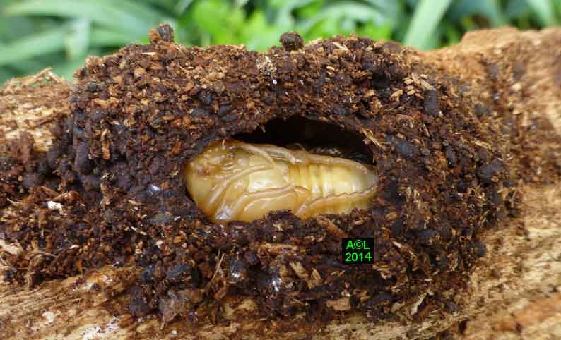 Contrairement à certaines cétoines, telle la "dorée" (Cetonia aurata, voir site), qui passent l'hiver au sein de "coques" parfaitement individualisées et solidement constituées, les logettes du Gnorimus sont moins durablement élaborées car il n'y a pas d'hivernage, d'où une phase nymphale considérablement réduite. Elles sont en outre susceptibles de varier d'aspect et de consistance, en intégrant par exemple un fort pourcentage de particules boiseuses là le volume de terreau disponible est réduit, ou au contraire en privilégiant le terreau là où il abonde.