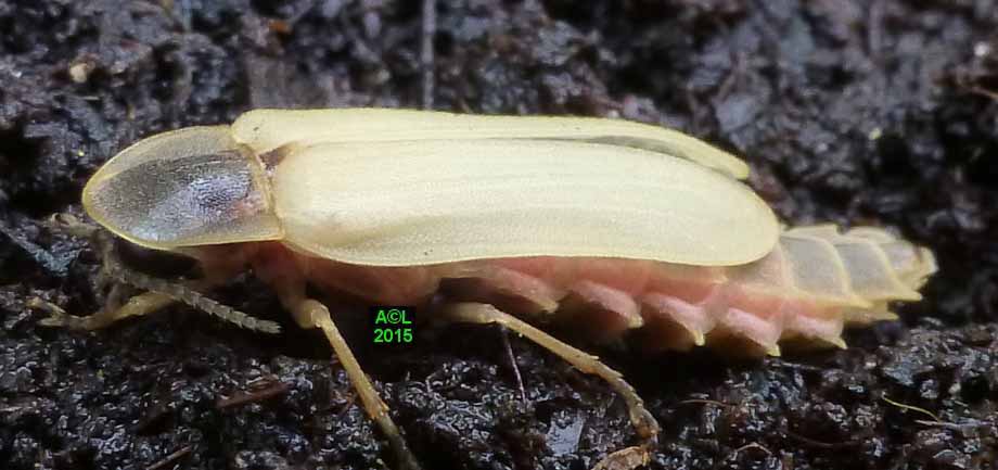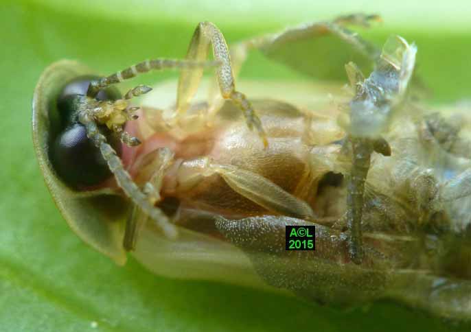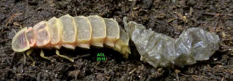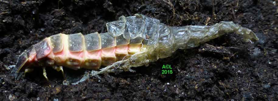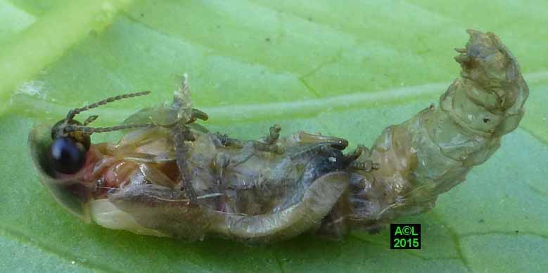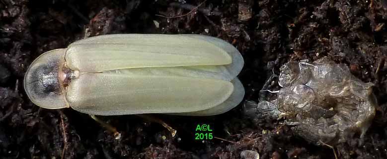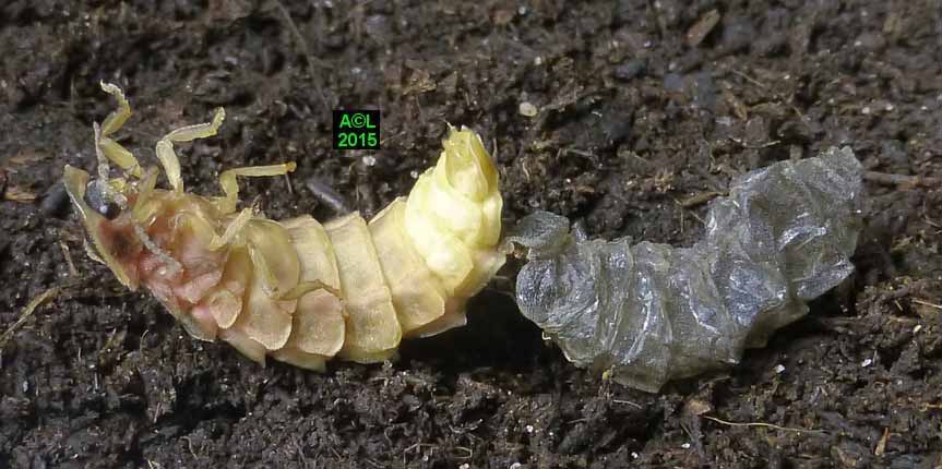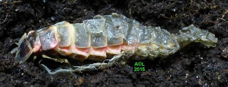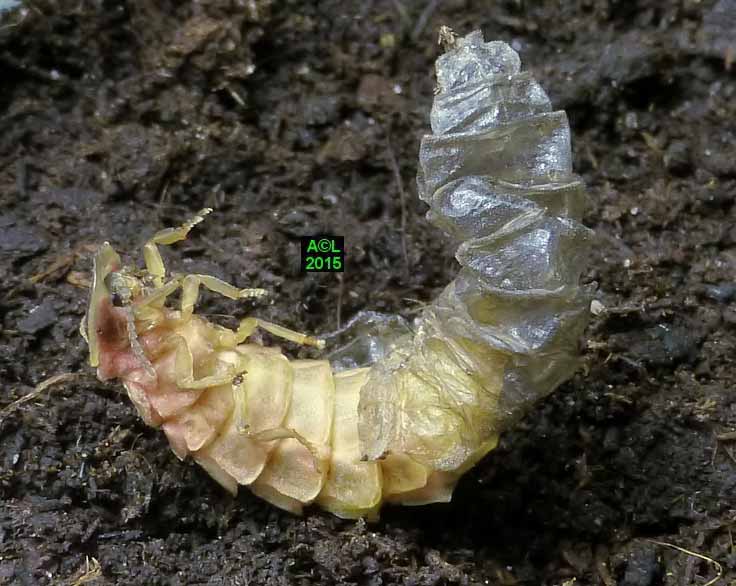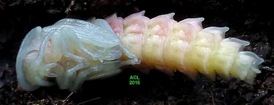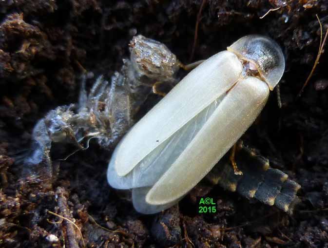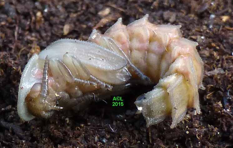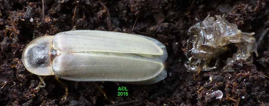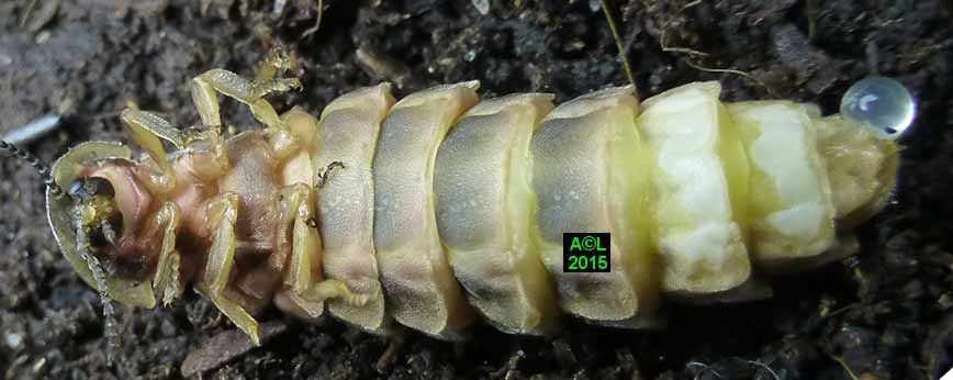 Le moment venu, et donc au terme de son développement, la larve va rechercher un "dessous de quelque chose" en contact avec le sol , tel que bois mort, pierre ou mousse. Profitant d'un creux (ou l'aménageant ? ) elle va ensuite s'y immobiliser sur le dos durant une dizaine de jours, en attendant que Dame Nature "fasse son boulot" et déclenche la mue nymphale. Ultérieurement, quand le temps aura là encore fait son oeuvre, la dernière mue (dite imaginale) va avoir lieu, et donner cette fois une femelle lampyre adulte, et donc apte à "lumignoner" ... et se reproduire !