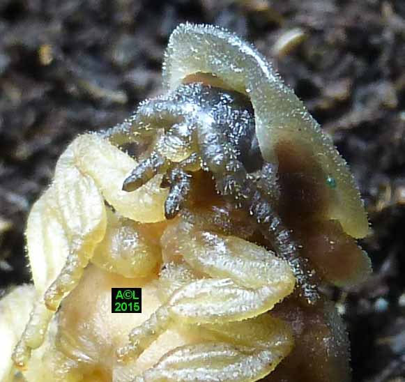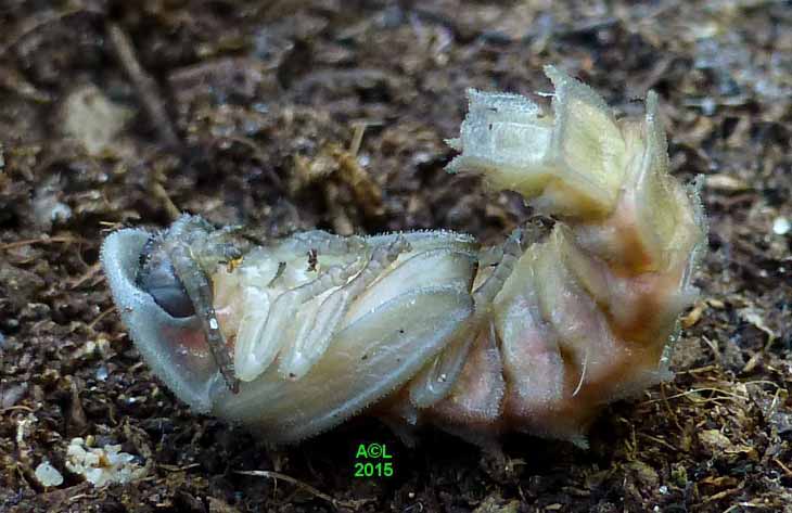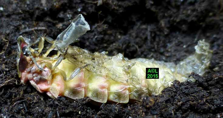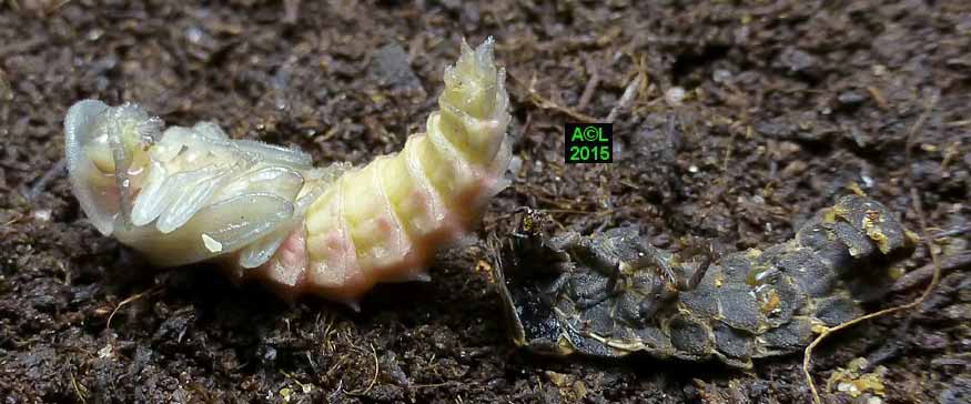 Arrivées à terme, généralement courant Mai, les larves des futurs mâles se comportent comme celles des femelles, à savoir chercher un gîte où elles se métamorphoseront en nymphe puis en insecte adulte ... si tout se passe bien ! A l'image de la météo, et de ses "caprices", toute vie a en effet ses aléas, et au pays des bestioles le prédateur des uns est très souvent la proie des autres.
