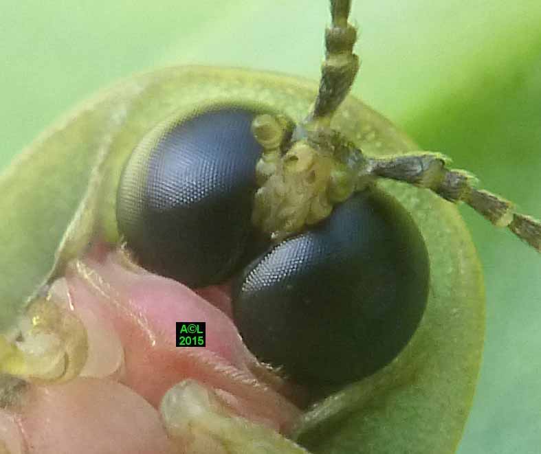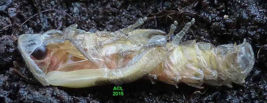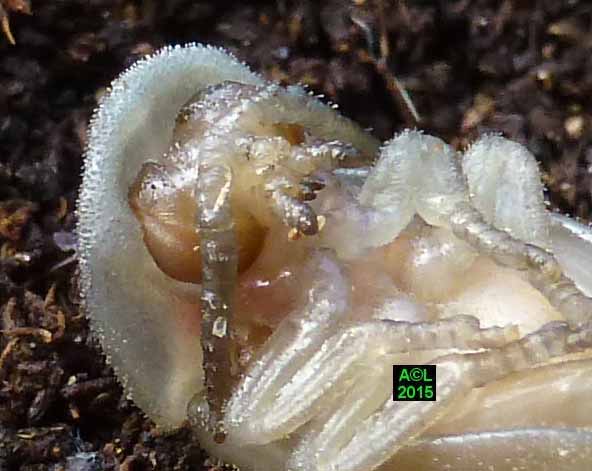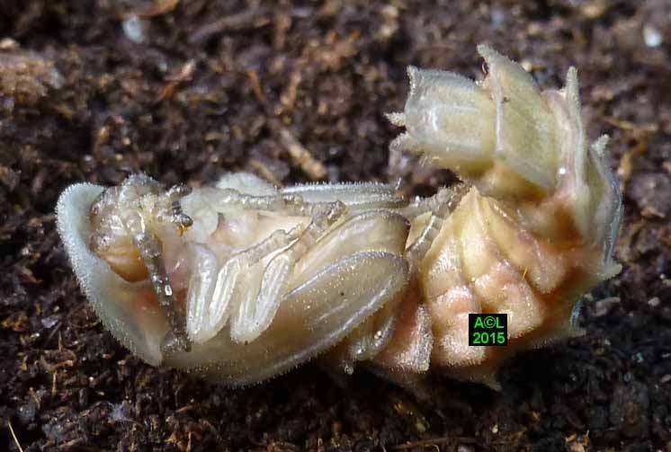 Après 2 petites semaines en intérieur à 20 ° (plutôt 3 "in natura"), la nymphe mue, et via cette ultime étape elle se fait mâle. En regard de sa lumineuse compagne, et des yeux de Chimène que lui porte le Web, on peut dire que le mâle ne "casse pas des briques", mais sans lui elle ne serait rien, aussi petit, terne, et insignifiant soit-il.