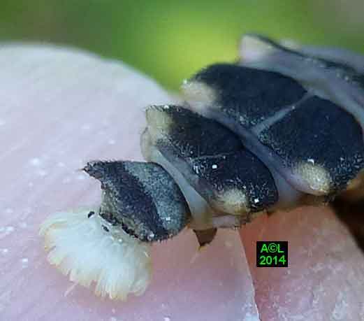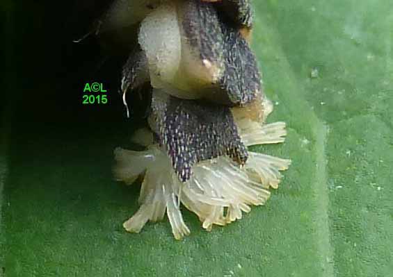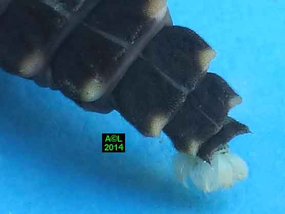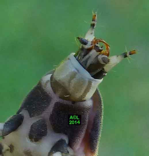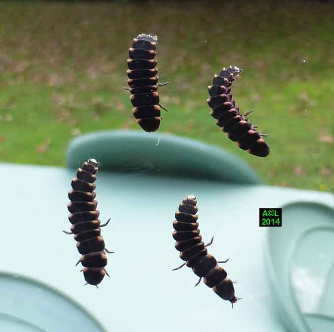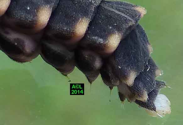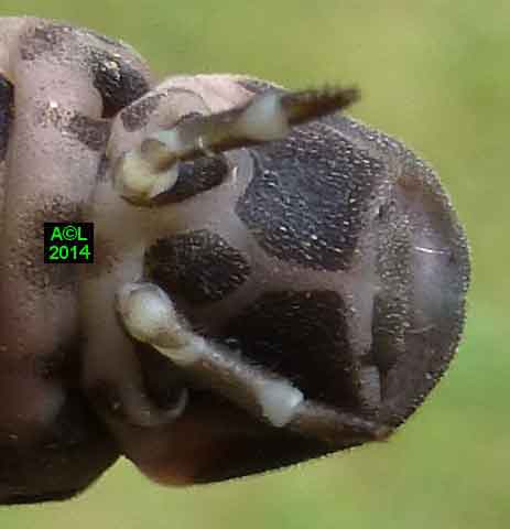La larve du lampyre dispose de 6 pattes parfaitement fonctionnelles, mais elles sont dépourvues d'ongles griffus, apanage de l'adulte, et se terminent donc par une simple pointe chitinisée, à l'évidence moins performante. Afin de parfaire le maintien et la propulsion, Dame Nature a prévu un "pygopode", sorte de "béquille" fonctionnant à la manière d'une 7e patte (à voir en vidéo ! ). Concrètement l'extrémité abdominale se replie, et fournit ainsi un appui supplémentaire (synchro avec les pattes), permettant de s'arque bouter, et au besoin de pousser pour faciliter la progression, ou encore "crapahuter", par exemple en terrain pentu ou accidenté.