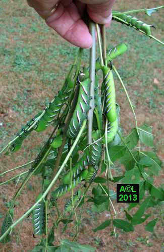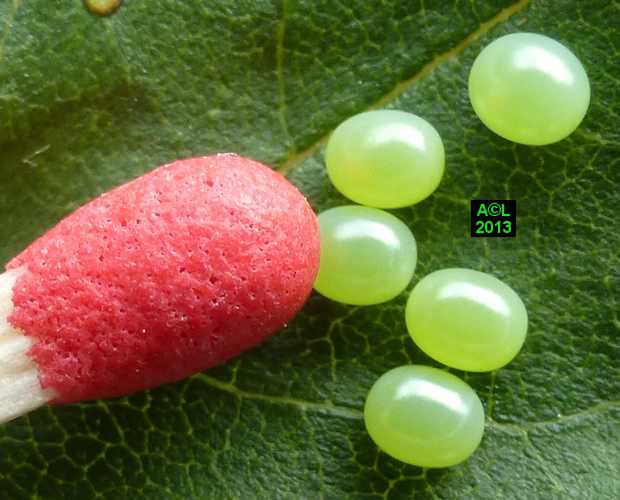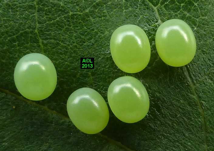 La ponte commence la nuit suivant l'accouplement, et elle peut se prolonger plusieurs jours , voire plusieurs semaines, y compris en élevage si la prise de nourriture est régulière et suffisante. Les oeufs sont joliment verts, relativement gros, et ils sont le plus souvent pondus au revers des feuilles nourricières, tantôt isolément, tantôt par lots comme ci-dessous. Présentement j'ai obtenu une cinquantaine d'oeufs, mais il s'agissait d'une femelle sauvage, et à coup sûr d'un reliquat de ponte. Ultérieurement une femelle captive a été nettement plus prodigue puisqu'elle m'a gratifié de ...avant de recouvrer sa liberté.